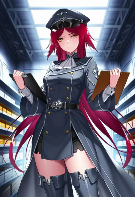 衣装15(軍服):hat, thighhighs, thigh boots, boots, uniform, belt, military, long sleeves, Dark blue-grey coat, gold buttons, white cuffs, black belt, silver buckle, white panels under the coat, dark blue-grey thigh-high boots, dark blue-grey cap with black peak, loose wide sleeves,