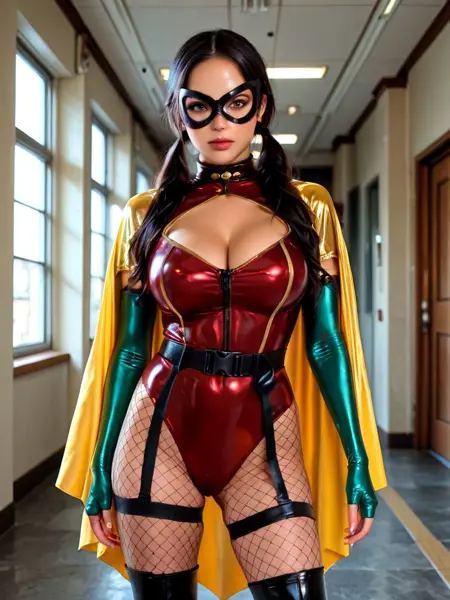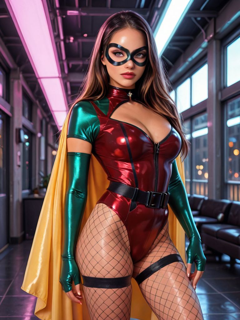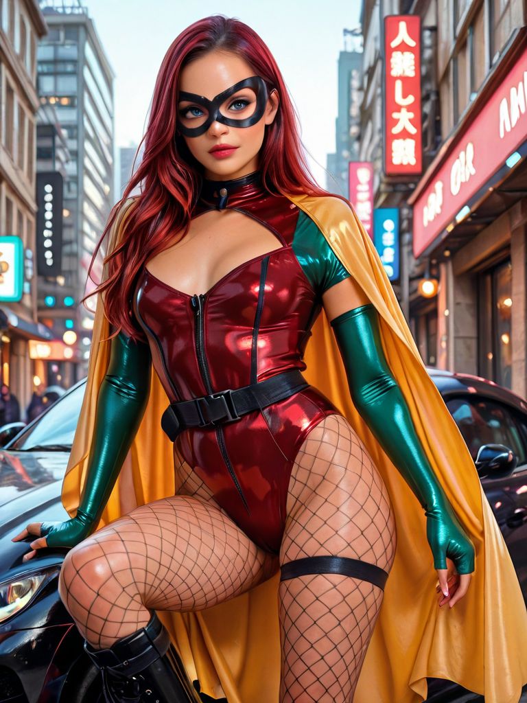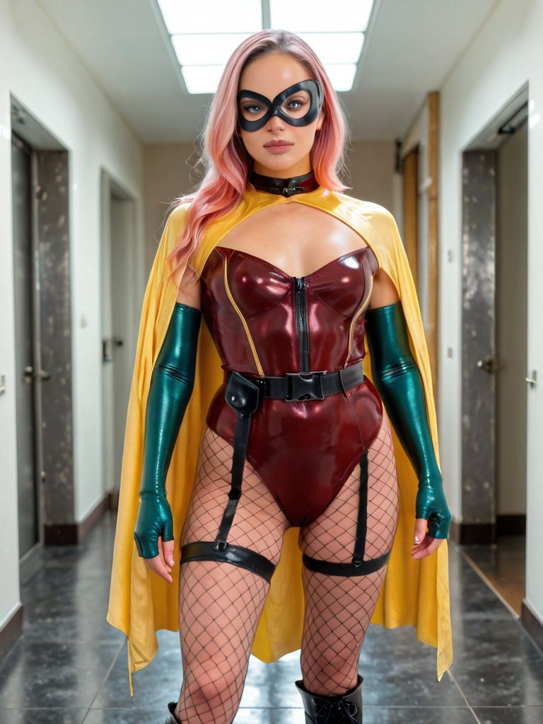ブラックドミノマスク、グリーン肘手袋、イエローケープ、レッドレオタード、ベルト、衣類のカットアウト、太ももストラップ、フィッシュネットタイツ、フィンガーレスグローブ、ジッパー、ツヤツヤの衣類、ラテックス、ブーツ,
