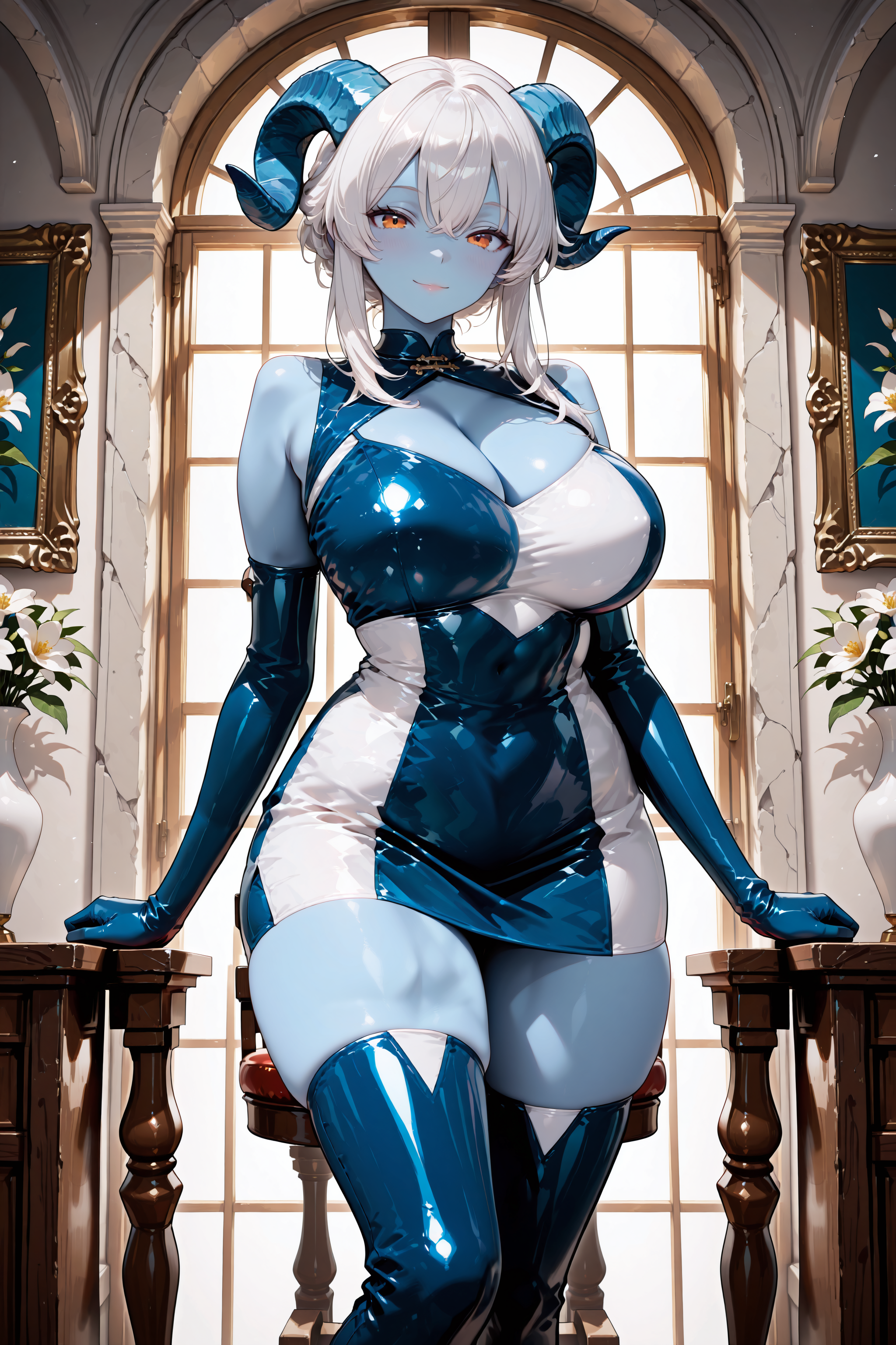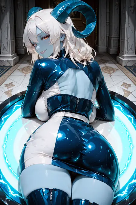 아웃핏과 피부 톤을 더 일관되게 얻고 싶다면, "blue skin, two-tone dress, blue dress, white dress"와 같은 프롬프트를 추가로 사용해 보세요.