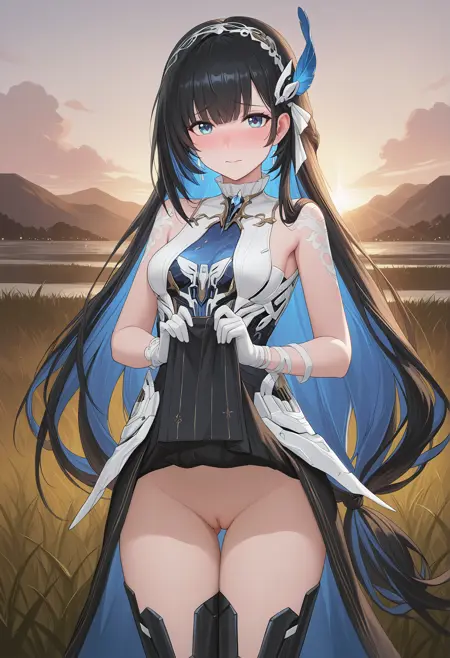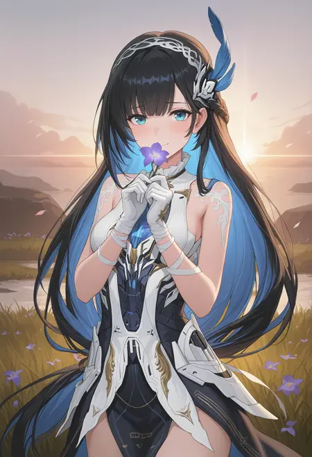 | 训练词汇 | yinhe,solo,long hair,breasts,bangs,blue eyes,black hair,blue hair,multicolored hair,sleeveless,white gloves,black dress,sleeveless dress,colored inner hair,mecha musume,bandaged arm,wrist bandages,waist ornament,shoulders tattoo,hairband,feather hair ornament,long hemline,Mechanical chest center,Mechanical center,Mechanical legs,hair tied,Mechanical body,low-tied long hiar,high heels,1girl,pelvic curtain,long hemline,braid,grey eyes已复制! |