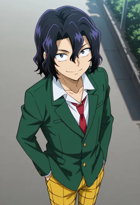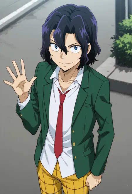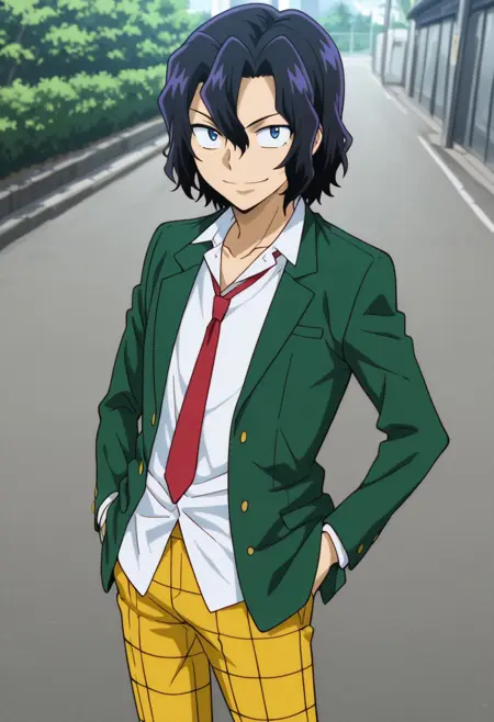 1个男孩,男性焦点,单人,蓝眼睛,黑发,校服,白衬衫,有领衬衫,锁骨,红色领带,绿色夹克,黄色裤子,格子裤,
