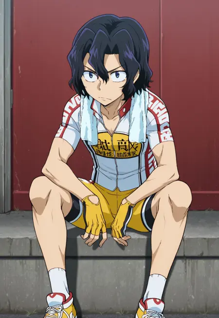 1个男孩,男性焦点,单人,蓝眼睛,黑发,骑行服,白黄相间衬衫,锁骨,短袖,黄色手套,无指手套,黄色短裤,骑行短裤,白袜,鞋子,黄色鞋履,
