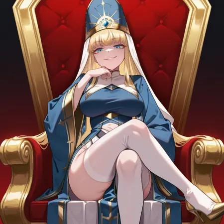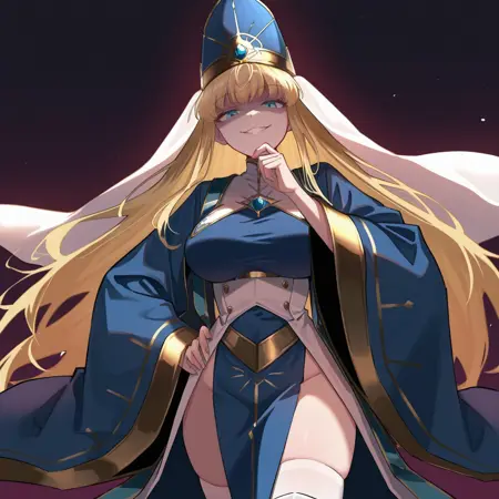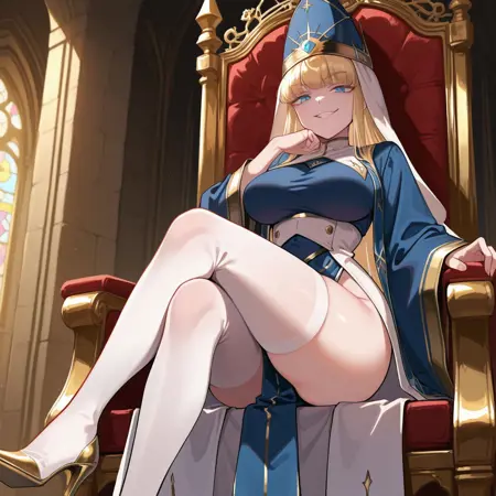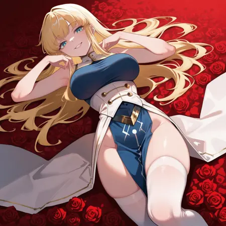 服装:白色领子,蓝色上衣,无袖上衣,蓝色胯部帷幕,白色腰披,金色装饰,白色大腿靴,金色高跟鞋