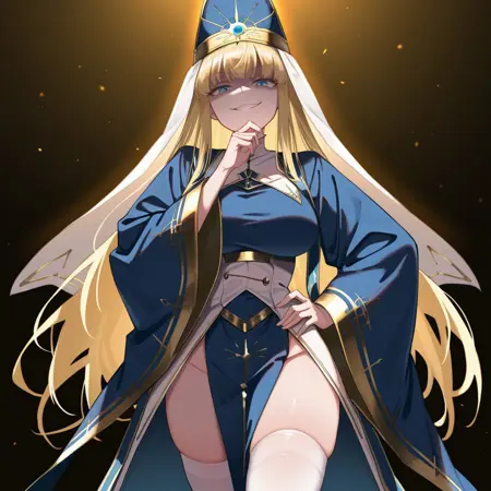 Outfit: white collar, blue top, sleevless top, blue pelvic curtain, white waist cape, golden ornaments, white thigh boots, golden heels