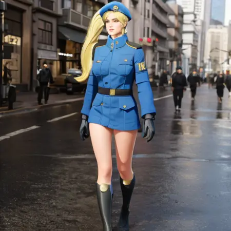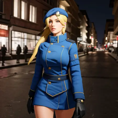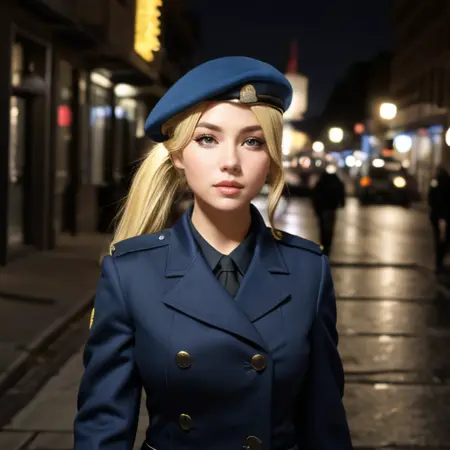 Trigger: woman, blonde hair, ponytail, blue uniform, beret (red glasses if u want)