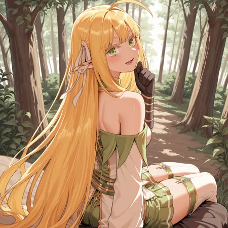 - tiaill、エルフ、とがった耳、長い髪、金髪、緑の目、1人 girl、胸、アホ毛、ピアス、tiaout1、ハイソックス、肩出し、ドレス、手袋、ヘアリボン、ガーター straps、太ももブーツ、スカート、黒の手袋、緑のスカート