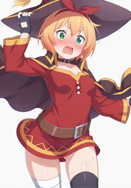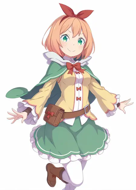 Petra-Liver020, PetraArc9-Liver020, 1girl, solo, short hair, orange hair, pink hair, blonde hair, bangs, hair between eyes, hairband, red hairband, bow hairband, hair bow, hair ribbon, red bow, ribbon, bow, braid, green eyes, blush, cape, capelet, green cape, hood, yellow shirt, white shirt, long sleeves, wide sleeves, detached sleeves, frilled sleeves, layered sleeves, short over long sleeves, white collar, red ribbon, red bowtie, green skirt, frilled skirt, skirt, belt, brown belt, belt pouch, pouch, fantasy outfit, adventure outfit, white pantyhose, pantyhose, white thighhighs, thighhighs, ornaments,