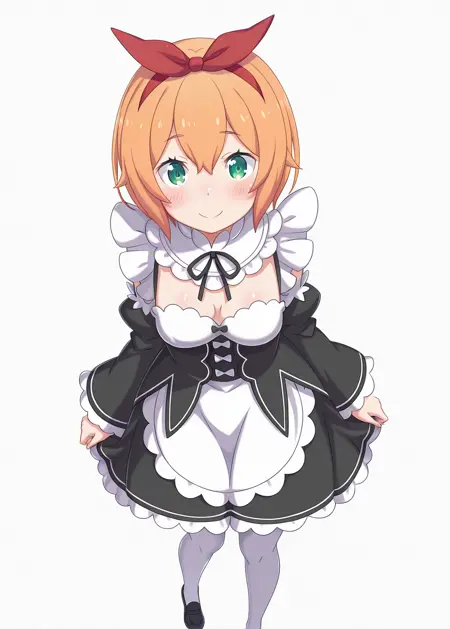 Petra-Liver020, PetraMaid-Liver020, 1girl, solo, orange hair, short hair, bangs, hair between eyes, hairband, red hairband, bow hairband, green eyes, blush, dress, maid, cosplay, roswaal mansion maid uniform, black dress, apron, waist apron, white apron, detached sleeves, long sleeves, detached collar, frills, bow, ribbon, black ribbon, red ribbon, neck ribbon, hair ribbon, pantyhose, white pantyhose, alternate costume,