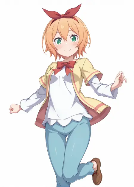 Petra-Liver020, PetraVillager-Liver020, 1girl, solo, orange hair, blonde hair, short hair, bangs, hair between eyes, hair ribbon, hair bow, hairband, red hairband, bow hairband, green eyes, blush, shirt, white shirt, yellow shirt, open shirt, long sleeves, short sleeves, layered sleeves, short over long sleeves, bowtie, jacket, pants, blue pants, bow, red bow, red ribbon, red bowtie, ribbon,
