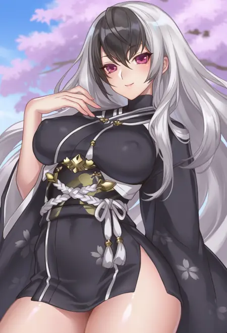 genni_muramasa, 흰 머리, 검은 머리, 다색 머리, 긴 머리, 보라색 눈, 큰 가슴