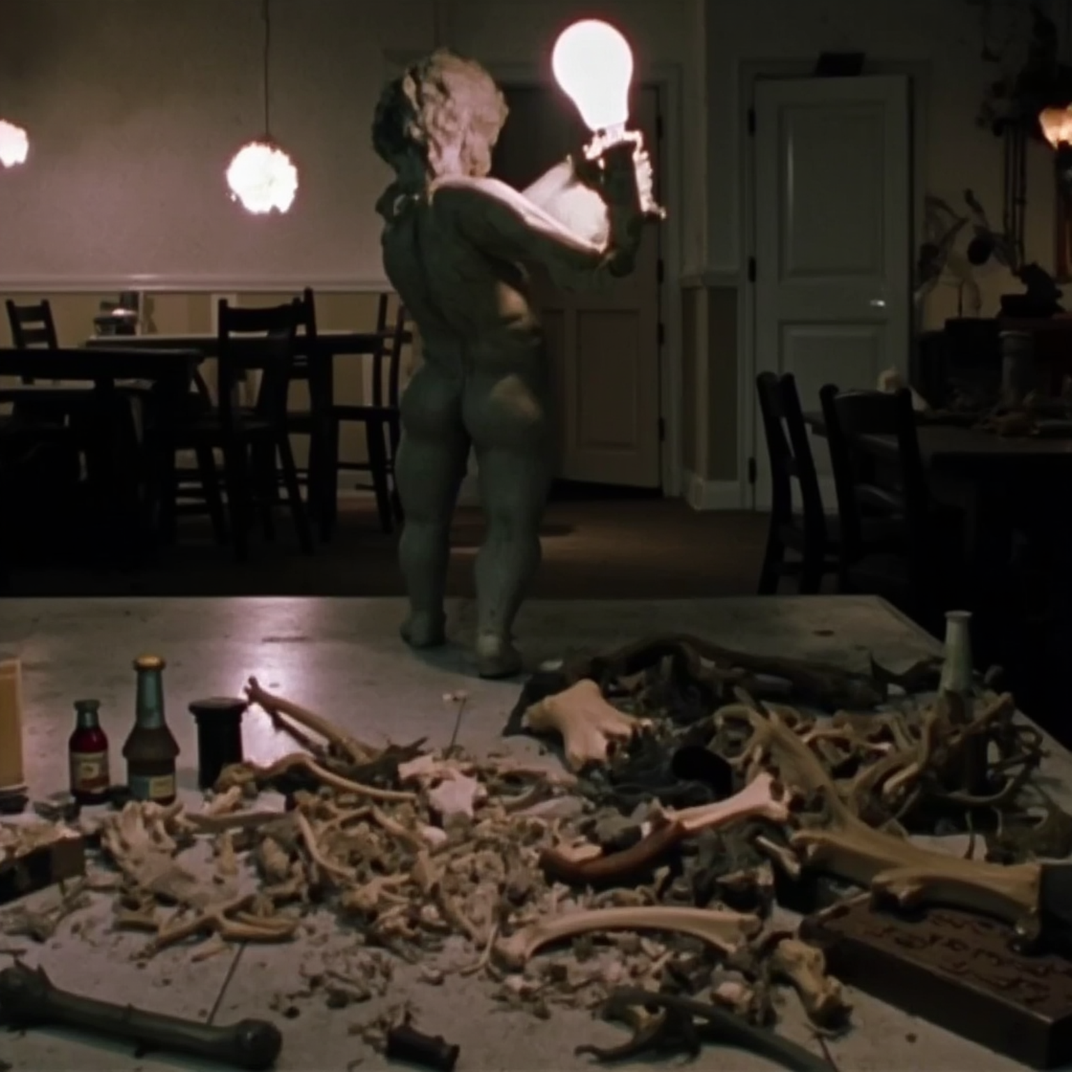 필요하다면 _"l34th3r a filthy small decrepit house with a skeleton on the floor and also some occult objects on the carpet. On the backside we can a steel door and ancient uncanny mannequins."_를 시도할 수도 있습니다.
