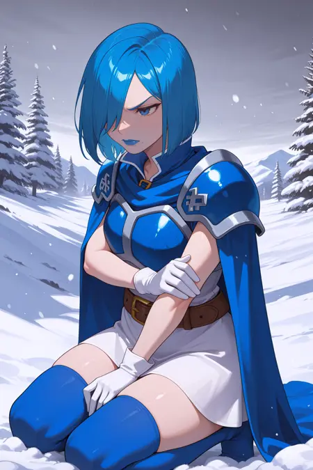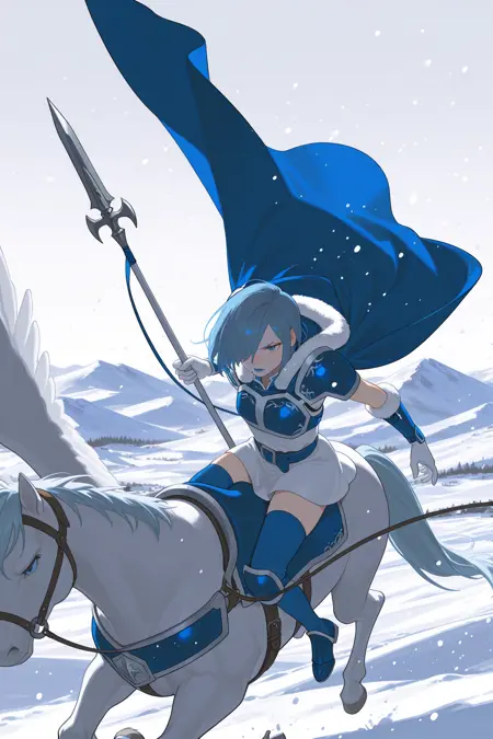 如需呈现她的典型外观,请添加 "蓝色盔甲、蓝色披风、肩甲、白色连衣裙、短裙、腰带、白色手套、蓝色过膝袜"。