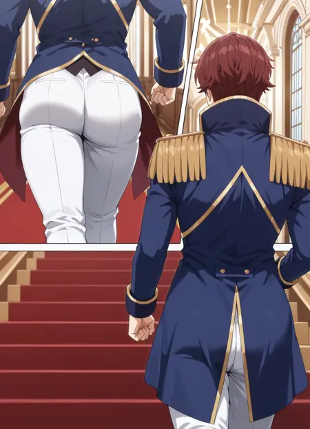 First outfit: epaulettes,prince uniform,white shirt under,navy blue tailcoat,gold trim,crimson cravat,white pants,black boots,