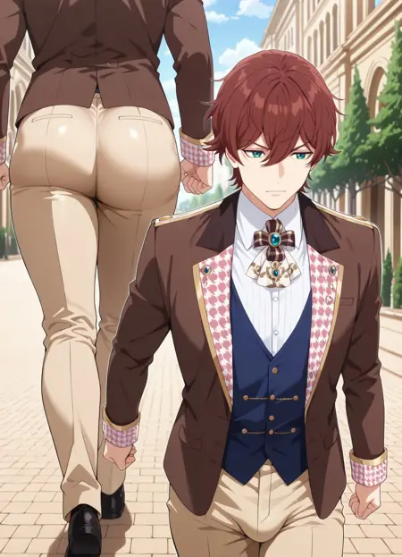 Second outfit: aristocratic uniform,brown blazer,gold trim,pink-and-white houndstooth pattern,blue vest,white shirt,ornamental ribbon tie,jewel and silver brooch,light brown pants,