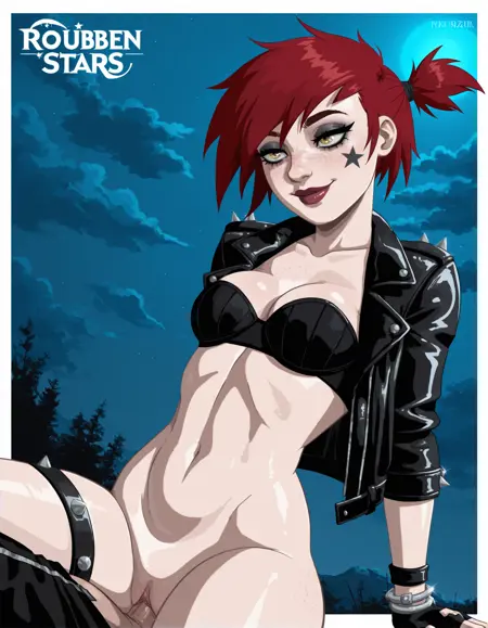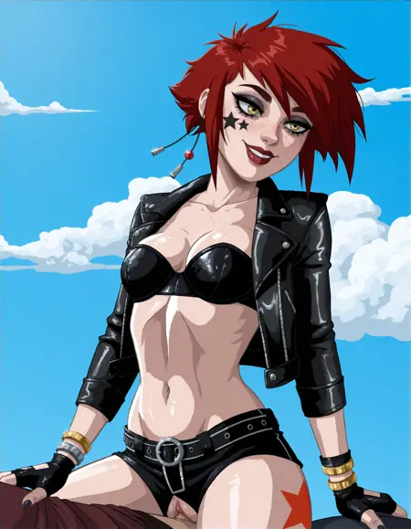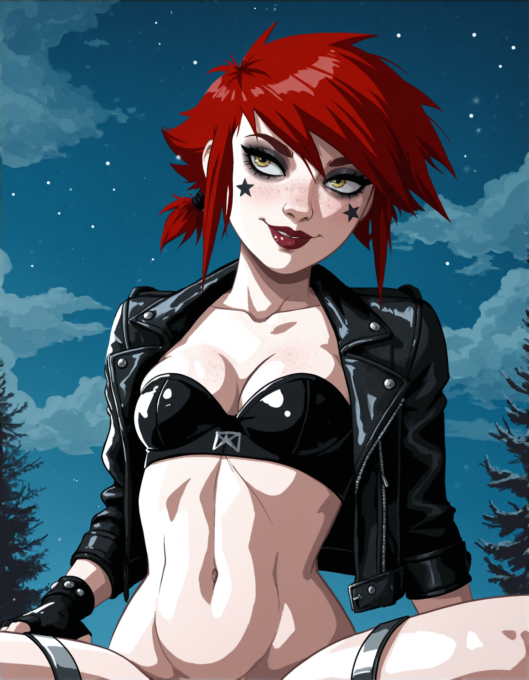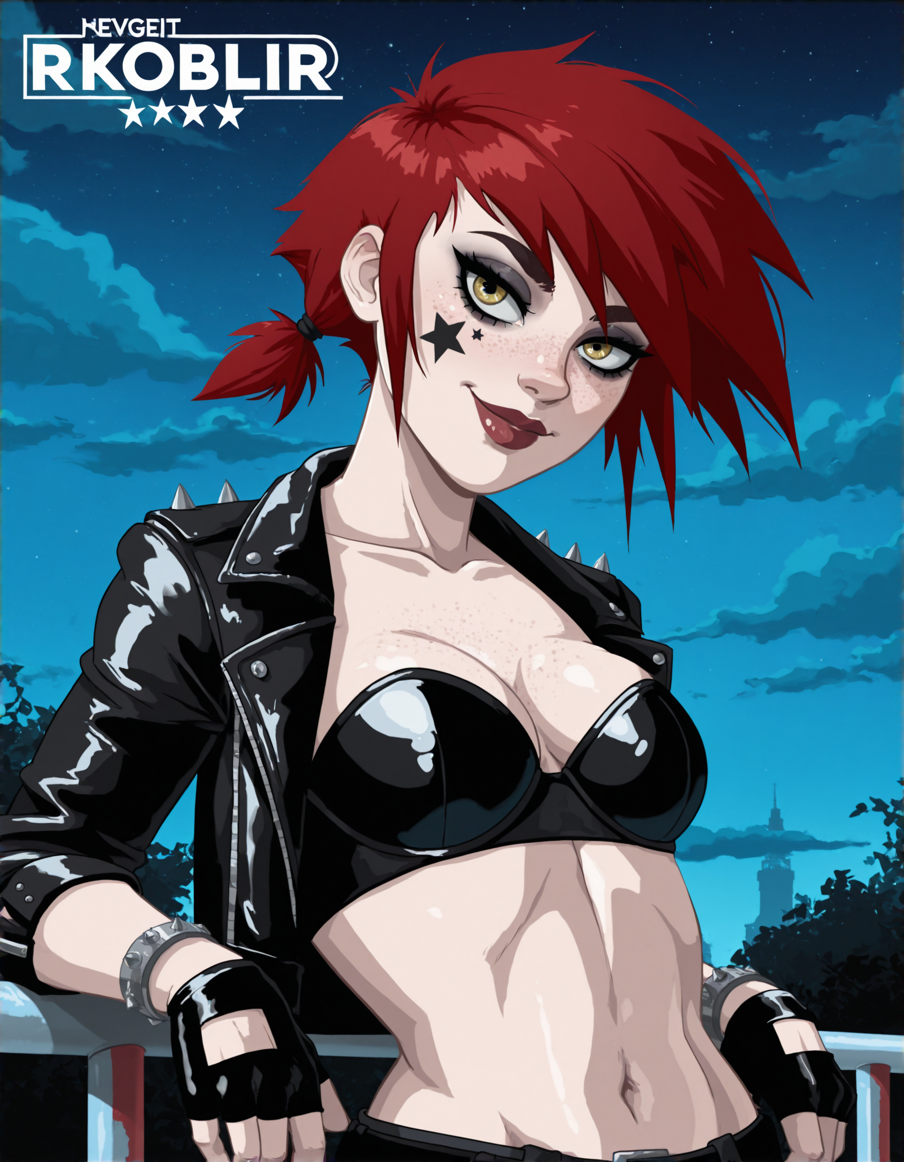 | 训练词汇 | rkobkr, 1girl, red hair, lipstick, fingerless gloves, small breasts, black bra, freckles, makeup, yellow eyes, short hair, leather jacket, open clothes, smile, sky, cloud, open jacket, black jacket, lips, navel, star (symbol), midriff, cleavage, strapless bra, night, two colorful star tattoos on cheek, side hair, red spiky hair tied with metallic bands已复制! |