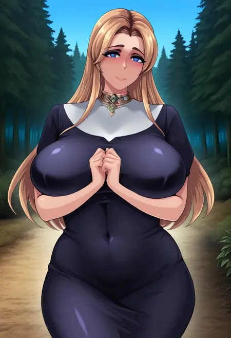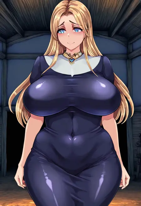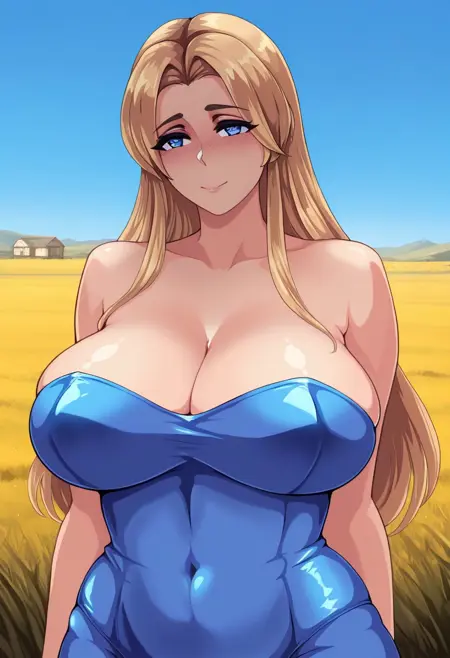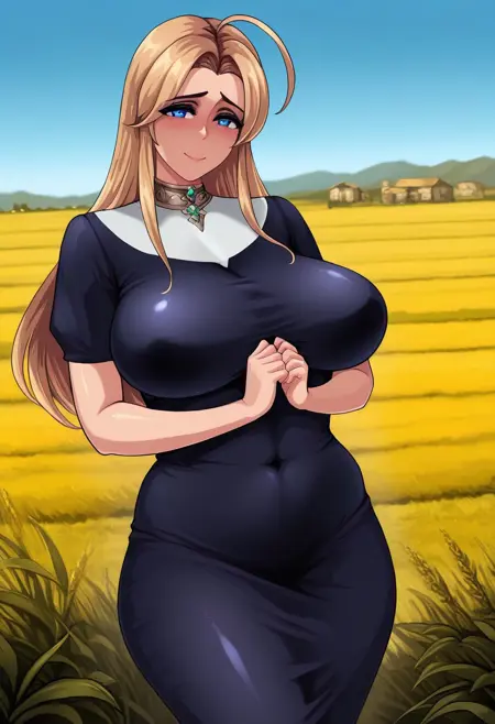 1 girl, blonde, thicc, busty, volupous, blue eyes, cute face, big breasts, huge ahoge, long hair,