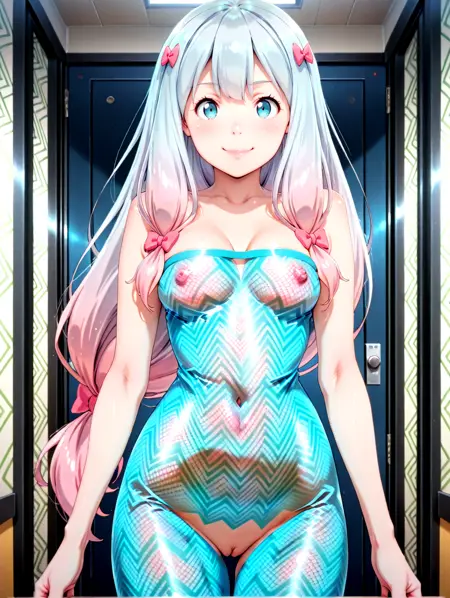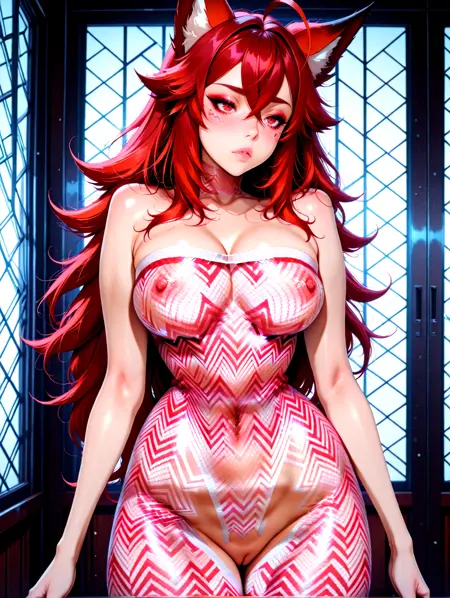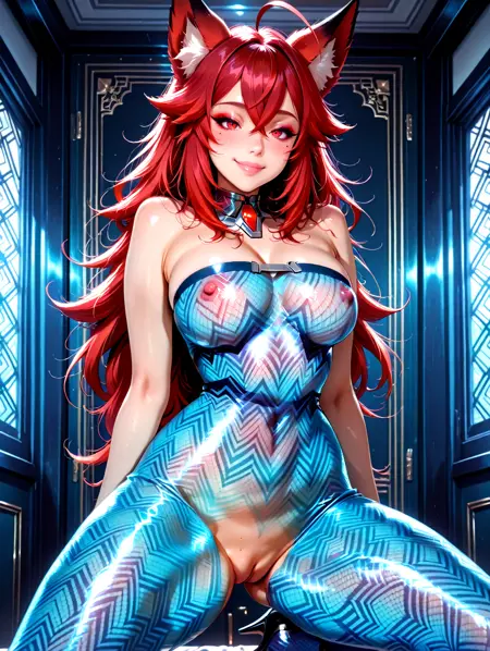 - Red fishnet bodysuit,(geometric zigzag pattern:1.5),strapless design,tight-fitting,sheer elastic fabric,bare shoulders,cleavage,covered nipples,see-through,(no panties:1.6),(pussy under the bodysuit:1.3),