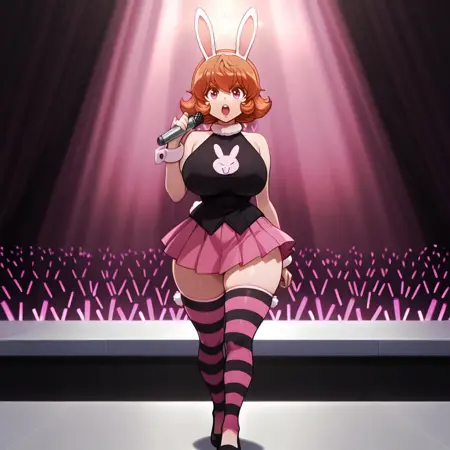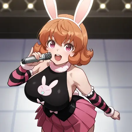 TAGS: orange hair, short hair, pink eyes, animal ears, rabbit ears, animal tail, rabbit tail, black top, halterneck, sleeveless, bunny logo, pink bow, pink skirt, pleated skirt, striped armwear, armwarmers, pink cuffs, striped legwear, thighhighs, black shoes, flats, bows, frills