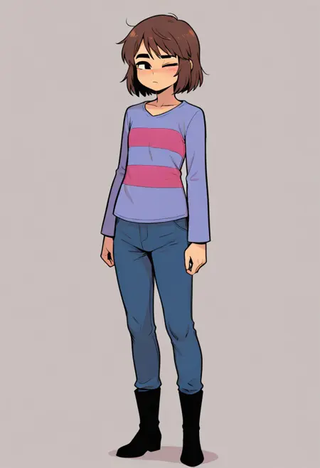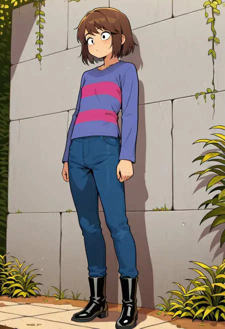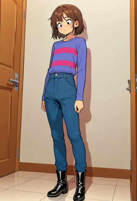 프롬프트: Frisky underhertail, solo, 1boy, light brown skin, black eyes, brown hair, long sleeve light blue shirt with two magenta stripes, blue pants, black boots