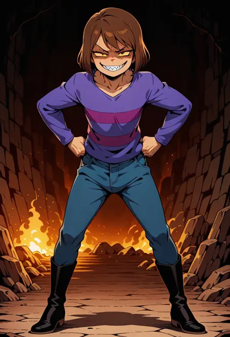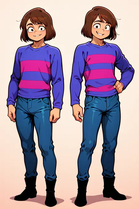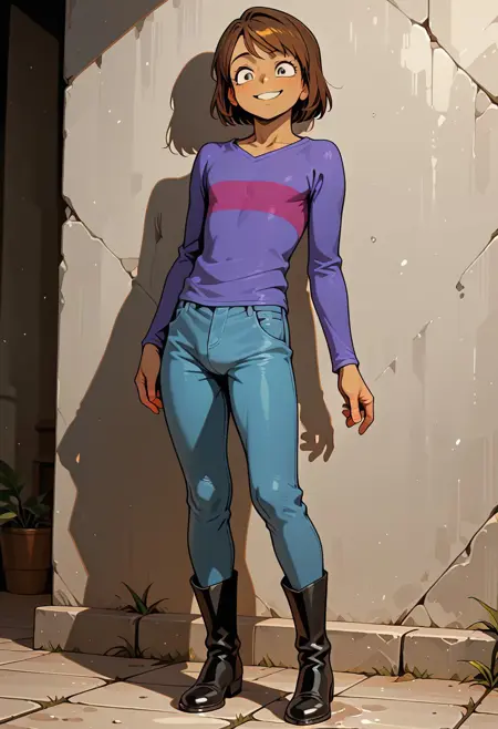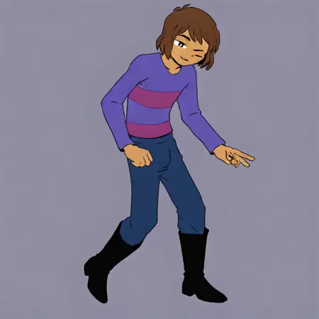 프롬프트: Frisky underhertail, solo, 1boy, light brown skin, black eyes, brown hair, long sleeve light blue shirt with two magenta stripes, blue pants, black boots