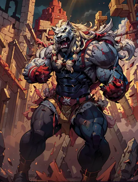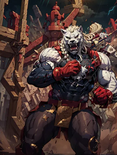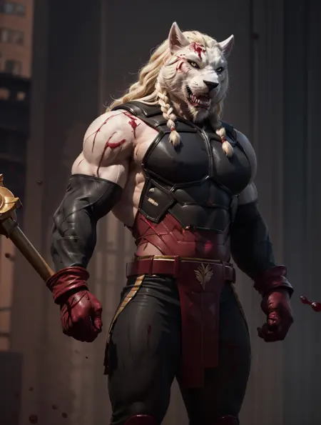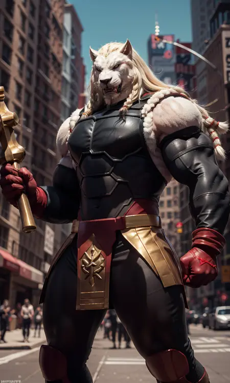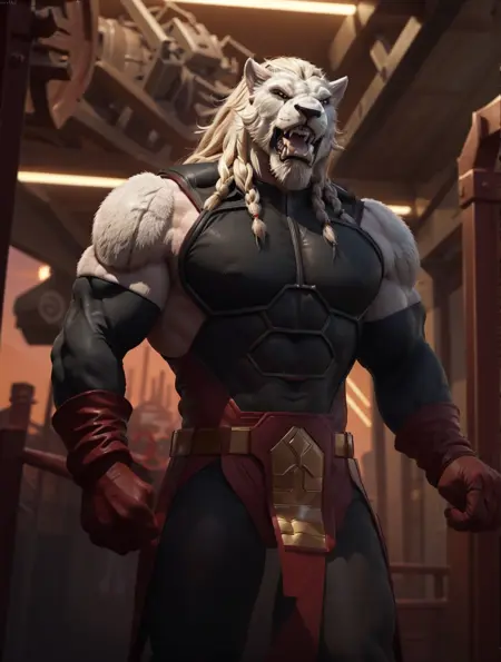 Outfit is black suit, armor, red and gold belt, gloves, white fur and braided mane.