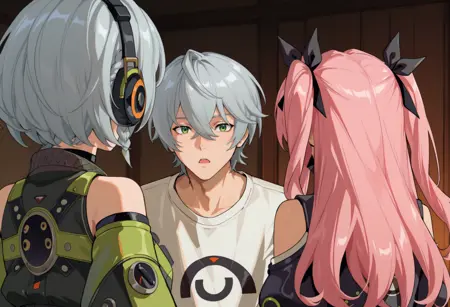 2girls, 1boy, lora:zzz\_wise\_noobAIXL11EPS:1 w1s3def, short hair, grey hair, hair between eyes, green eyes, white shirt, looking at viewer, open mouth,