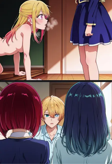 from side, 2girls, lora:zzz\_belle\_noobAIXL11EPS:1 b3ll3def, short hair, blue hair, hair between eyes, crossed bangs, ahoge, hairclip, green eyes, earrings, blush, open mouth, breath, arm support, bare shoulders, nude, indoors, floor,