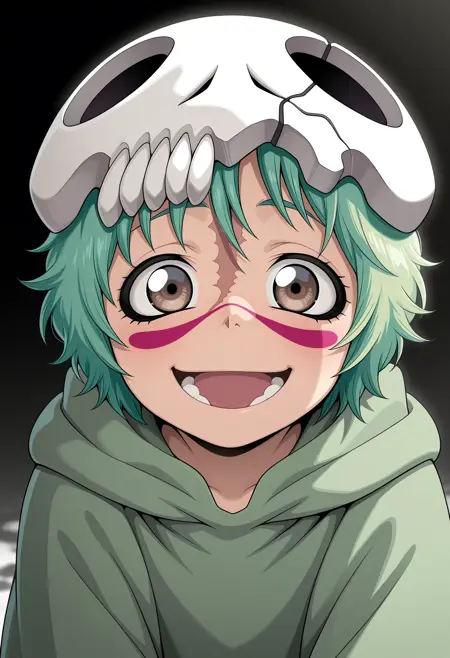 | Trained Words | nel, arrancar, skull on head, short hair, green hair, brown eyes, facial mark, scar on face, green robe, hooded robe,Copied! aqua hair, grey eyes,Copied! lower teeth only, missing tooth,Copied! anime screenshot, anime coloring,Copied! |