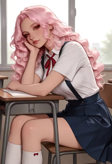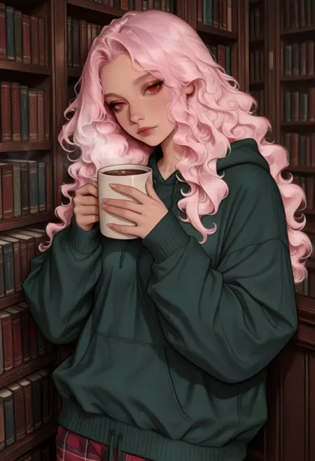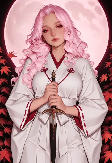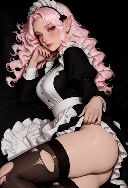 OCPnkRdL, 1girl, long hair, pink hair, wavy hair, red eyes, pointy ears