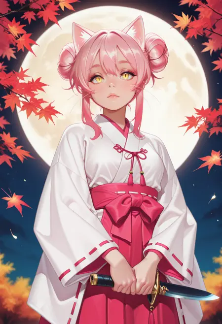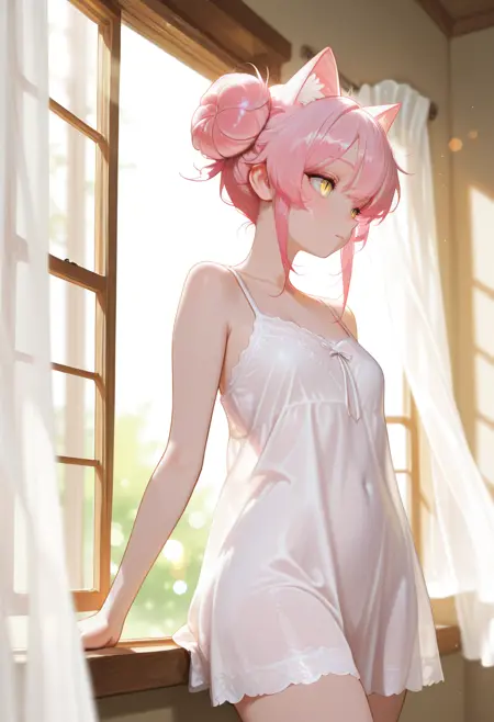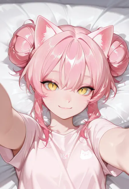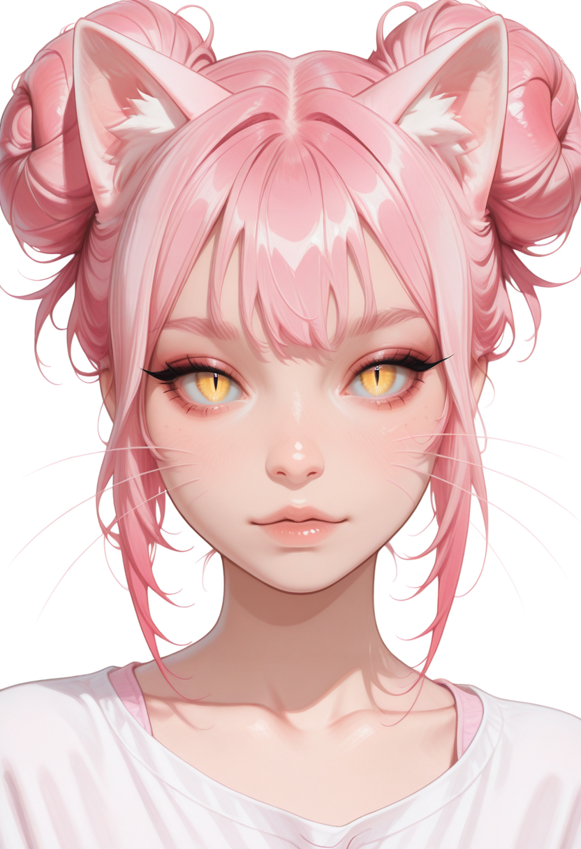 OCPnkGtGrl, 1girl, animal ears, twin bun, yellow eyes, pink hair, slit pupils, cat girl, whiskers