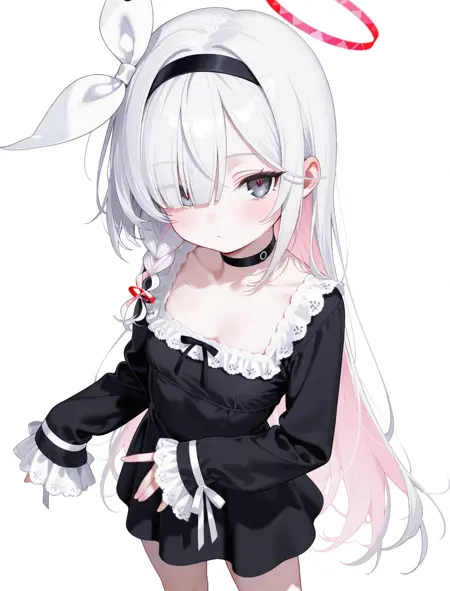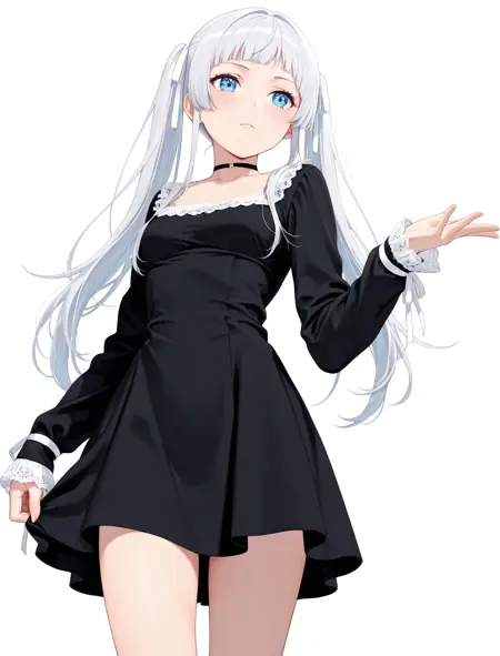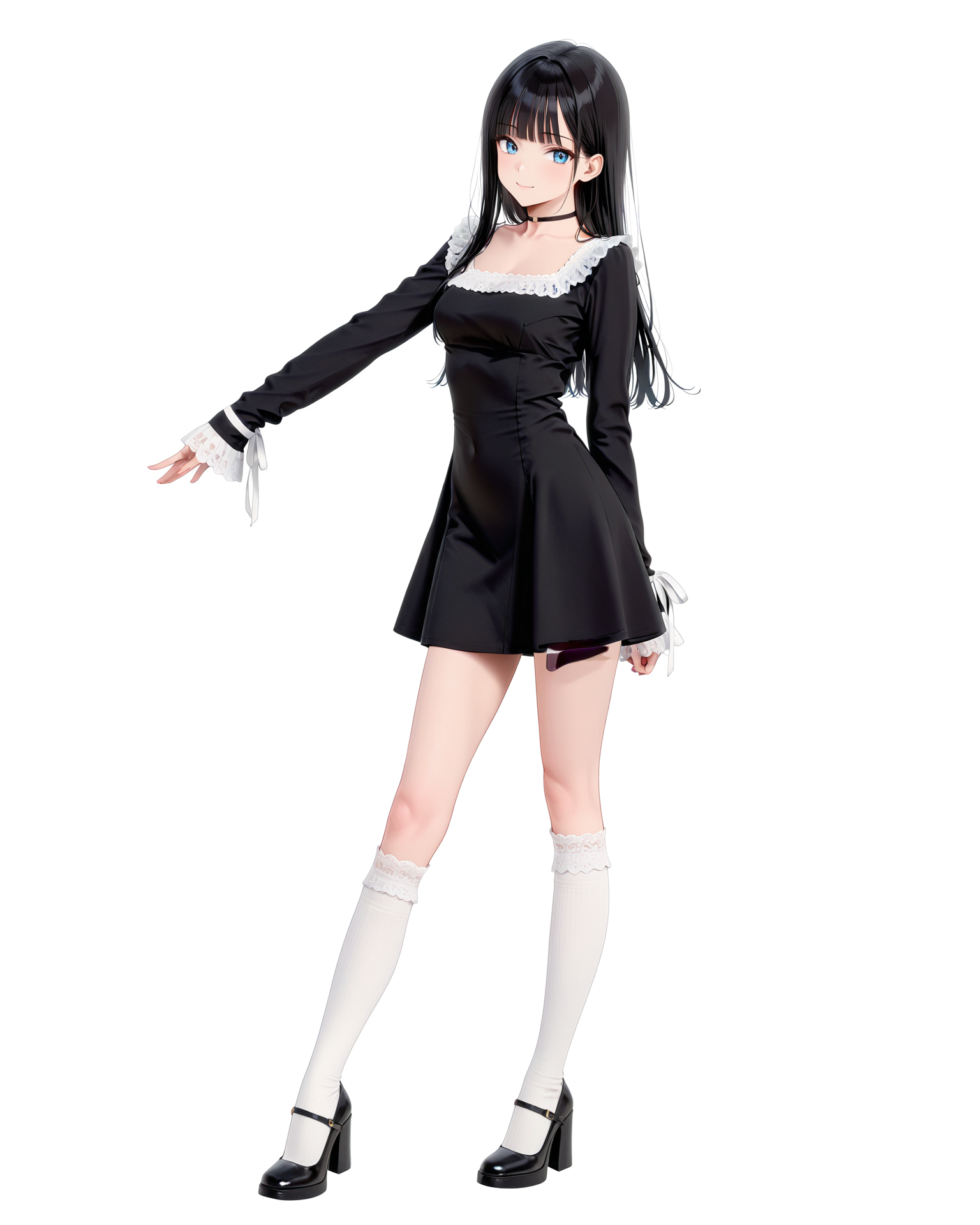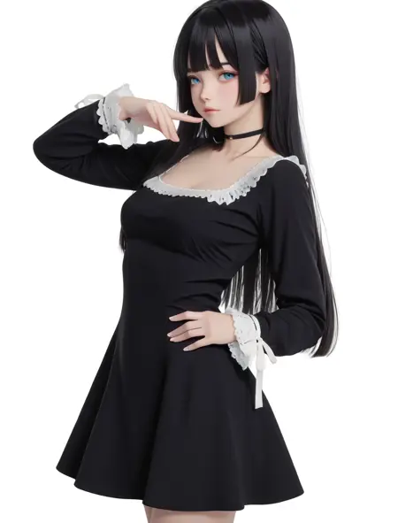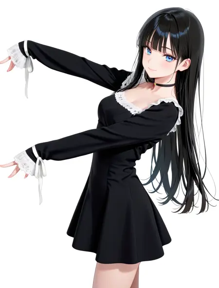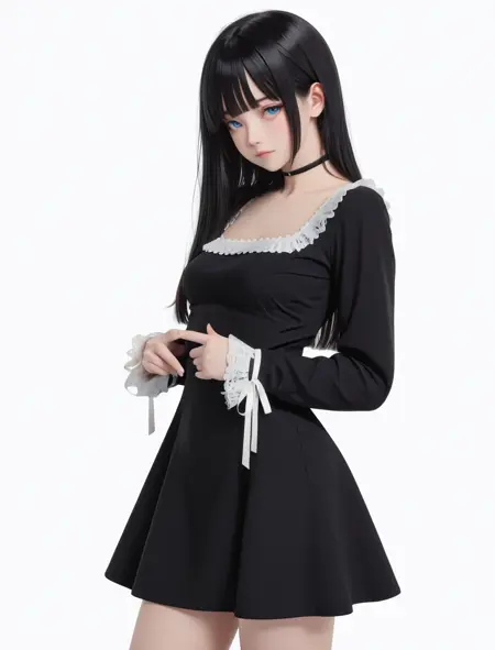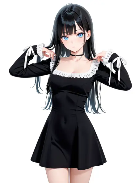 black short dress,square neckline,white lace neckline,black long sleeves,white lace wrist cuffs,frills,white ribbon,sleeves past wrists,