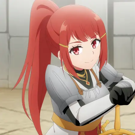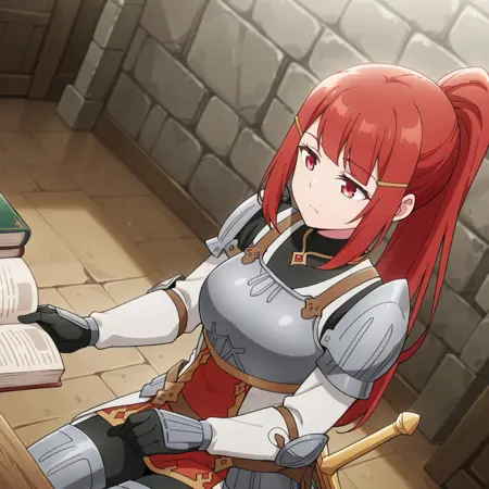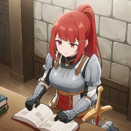 1girl, red hair, high ponytail, red eyes, long hair,sidelocks, double yellow hairclip, grey chest armor with red and gold accents, grey gauntlets with red accents and golden edges, thigh armor with red accents, black gloves, medieval stone walls, aged stonework, gold necklace, big breasts,