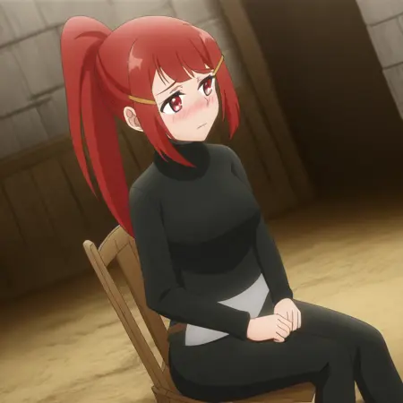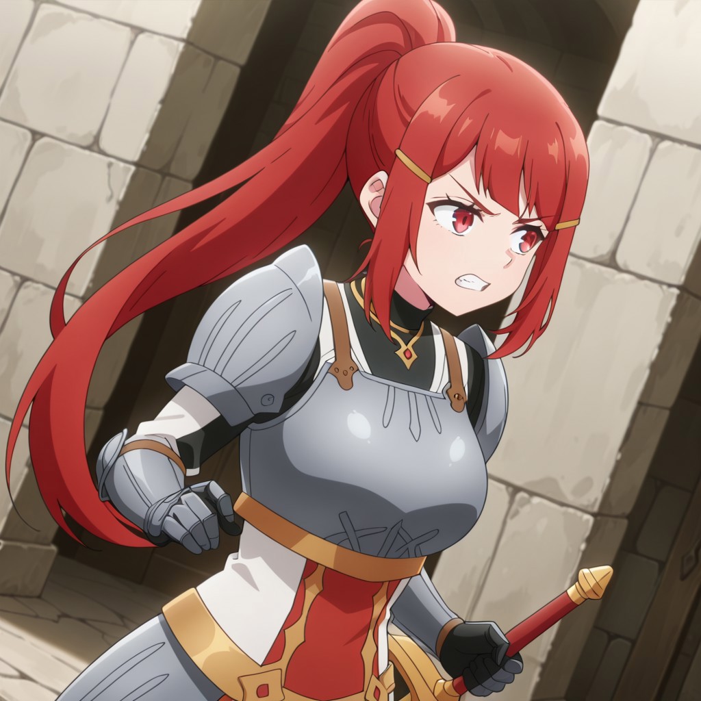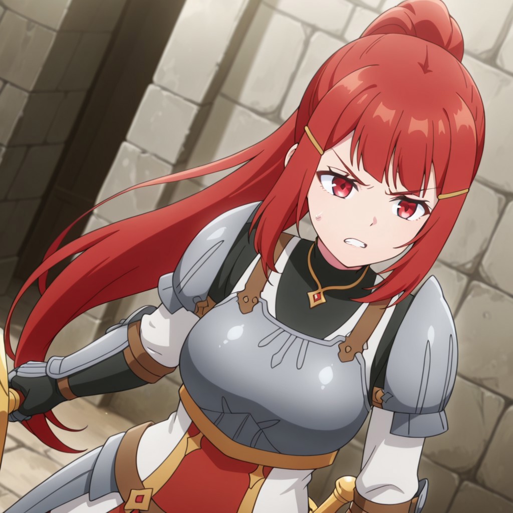 characterraina1girl, red hair, high ponytail, red eyes, long hair,sidelocks, double yellow hairclip, grey chest armor with red and gold accents, grey gauntlets with red accents and golden edges, thigh armor with red accents, black gloves, medieval stone walls, aged stonework, gold necklace, big breasts,