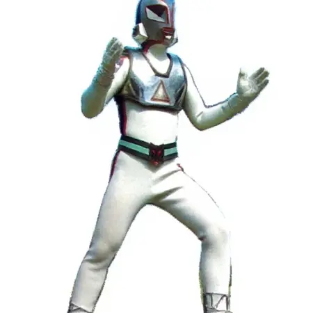 male focus, 1boy, mirrored helmet, red line edging, blue and red parts, crest, low-set ears, white rubber bodysuit with lines, mirrored chest armor with triangular mark and black edging, bracelets, ankle bands, belt