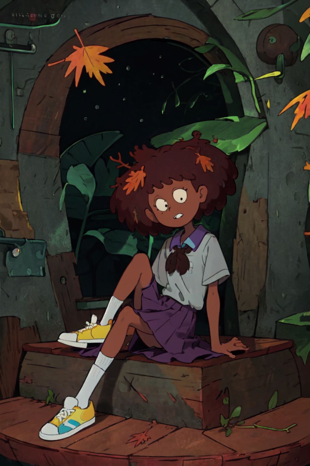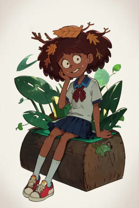 School uniform: Anne Boonchuy, flat chest, loli, short hair, brown hair, shirt, skirt, school uniform, hair ornament, sitting, shoes, teeth, socks, leaf, sneakers, leaf hair ornament, leaf on head