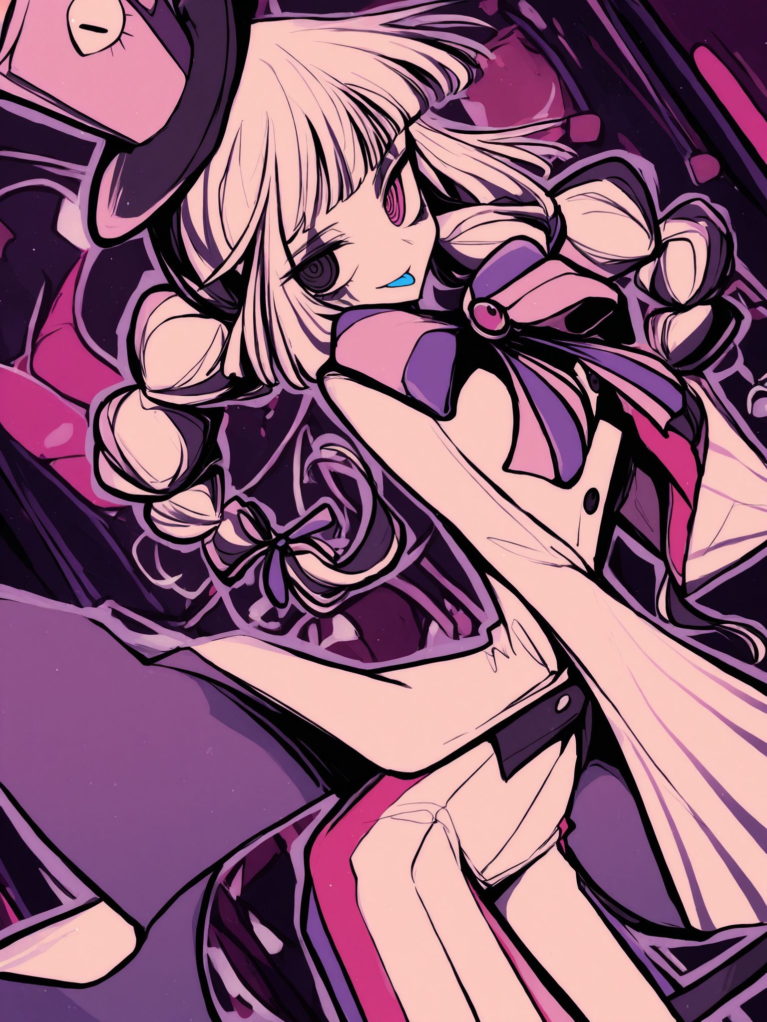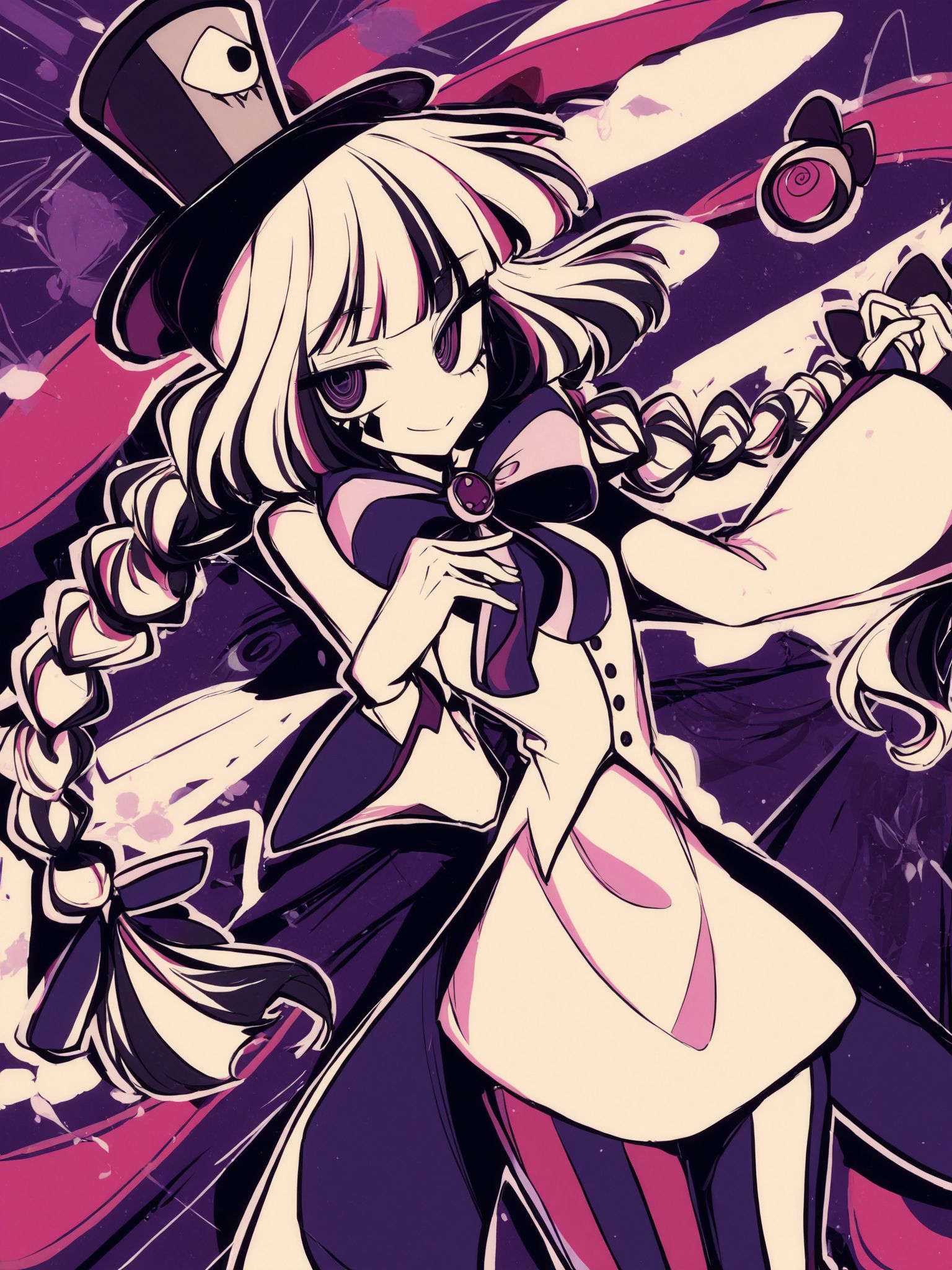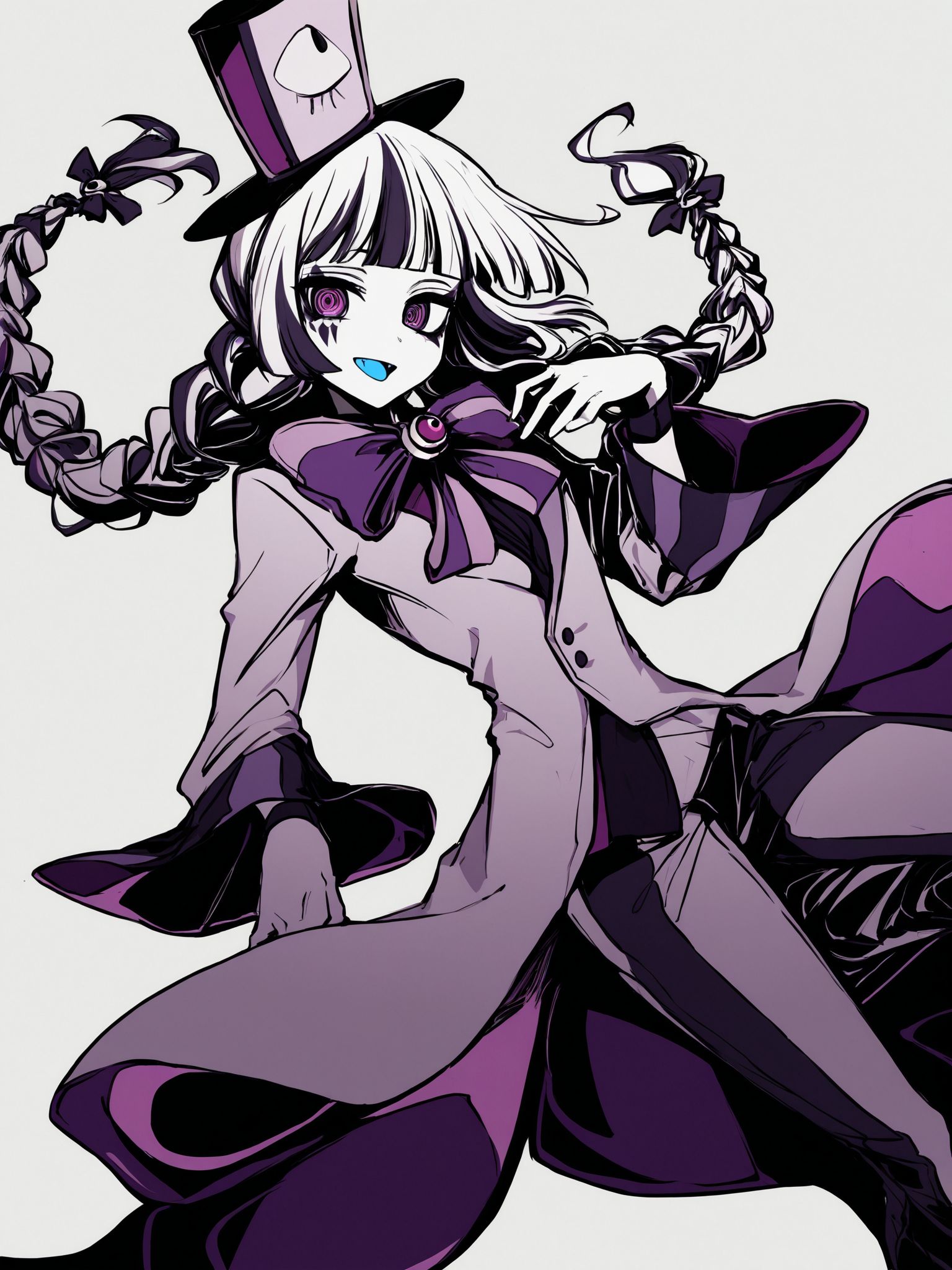 | トレーニングワード | ilsncrnvldelirini,long hair,multicolored hair,white hair,blunt bangs,twin braids,ringed eyes,pink eyes,purple eyes,black eyes,facepaint,top hat,limited palette,コピーしました! dress,long sleeves,wide sleeves,bowtie,purple bow,brooch,buttons,striped pants,コピーしました! |