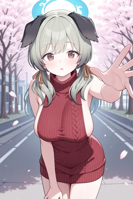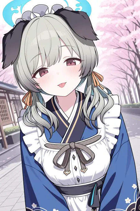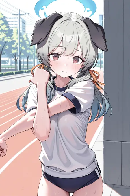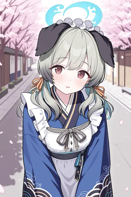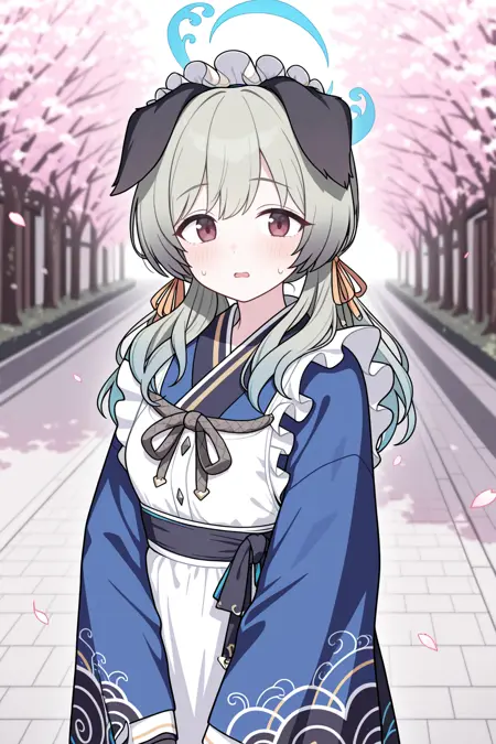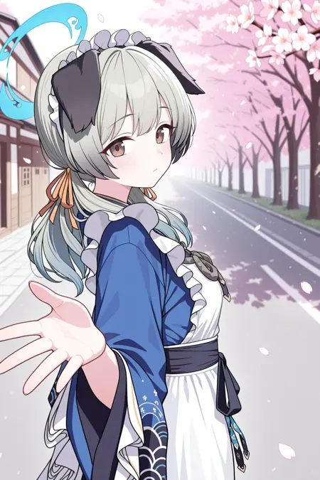 umika (蓝色档案),棕色眼睛,低双马尾,狗耳,渐变发色,灰色头发,发带,蓝色光环,长发,橙色丝带