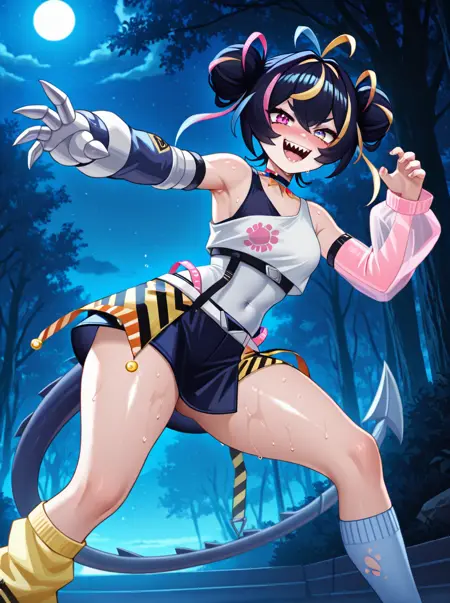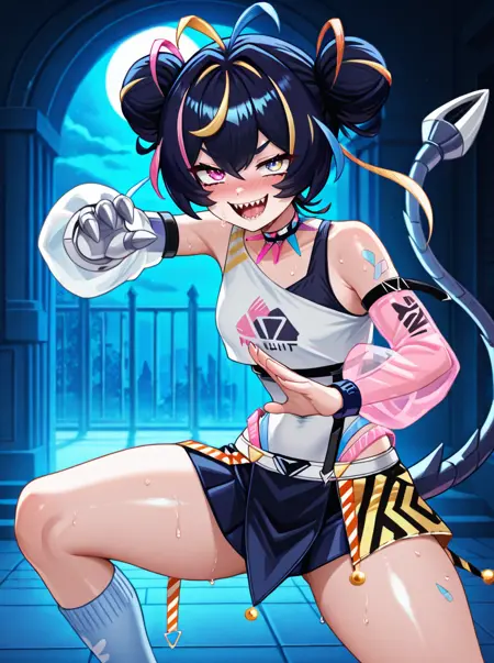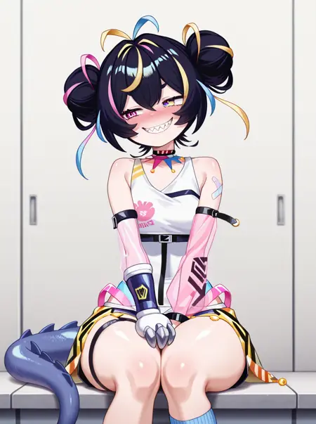 提示词:mikigeekyillust, 1girl, solo, hair bun, virtual youtuber, double bun, mechanical arm, heterochromia, black hair, sharp teeth, tail, , pink hair, blonde hair, streaked hair, single sock, see-through sleeves, single sleeve,