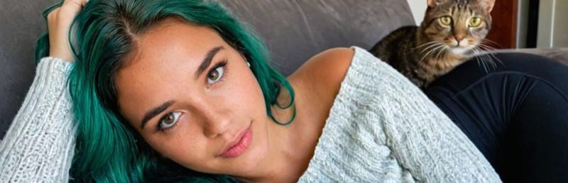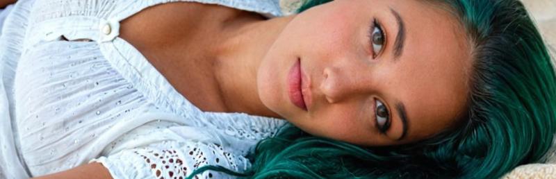 "woman581, green hair, Photo lora:woman581:0.7 19-year-old Brazilian woman, soft face, warm golden tan skin with smooth texture, long wavy emerald-green hair cascading over shoulders, deep brown almond-shaped eyes, defined cheekbones, soft round nose, naturally full lips."