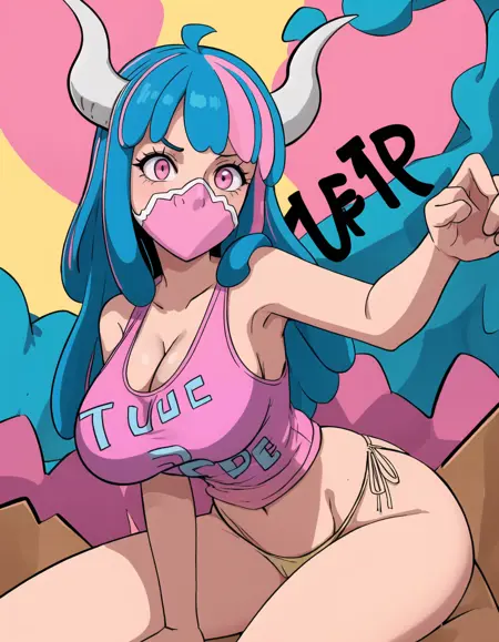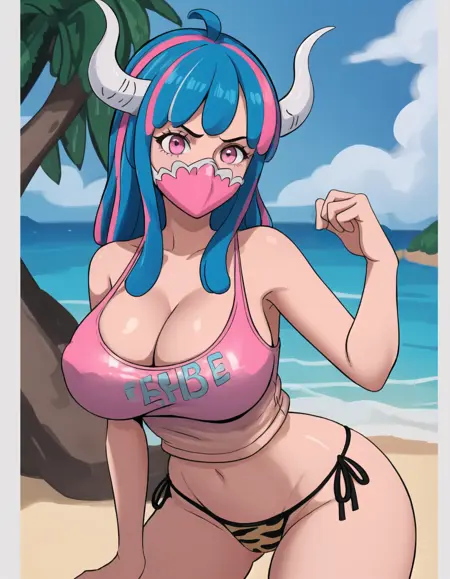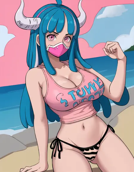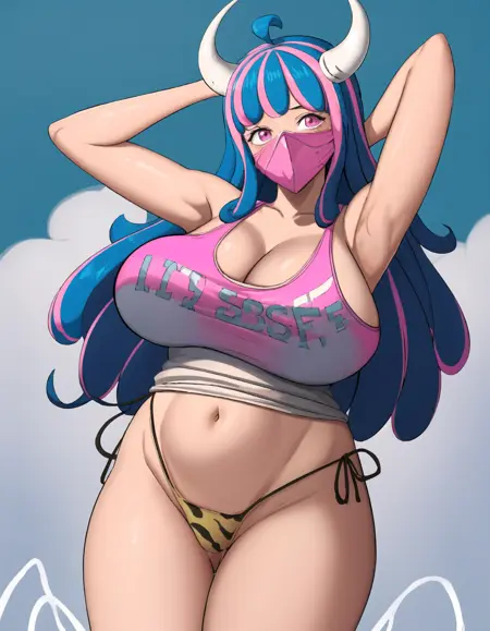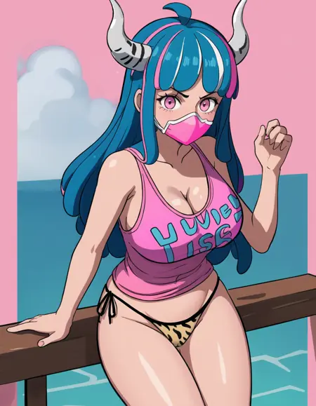 Useful prompts: 1girl, solo, long hair, blue hair, mask, mouth mask, horns, two-tone hair, breasts, large breasts, cleavage, navel, swimsuit, bangs, pink eyes, side-tie bikini bottom, tank top, streaked hair, clothes writing, animal print, ((white horns))