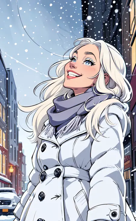 (cartoonish style), flat color style, illustration of a woman, walking down the street, long platinum blonde hair blowing in the wind, wearing winter coat and a scarf, looking happy, looking up at the sky, snowing, snow, cold winter day, busy city background, cars, buildings, detailed face, perfect eyes