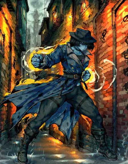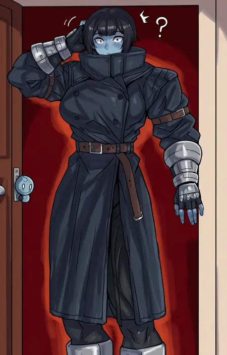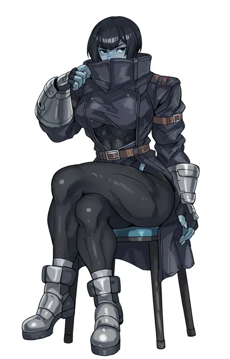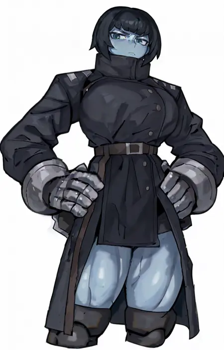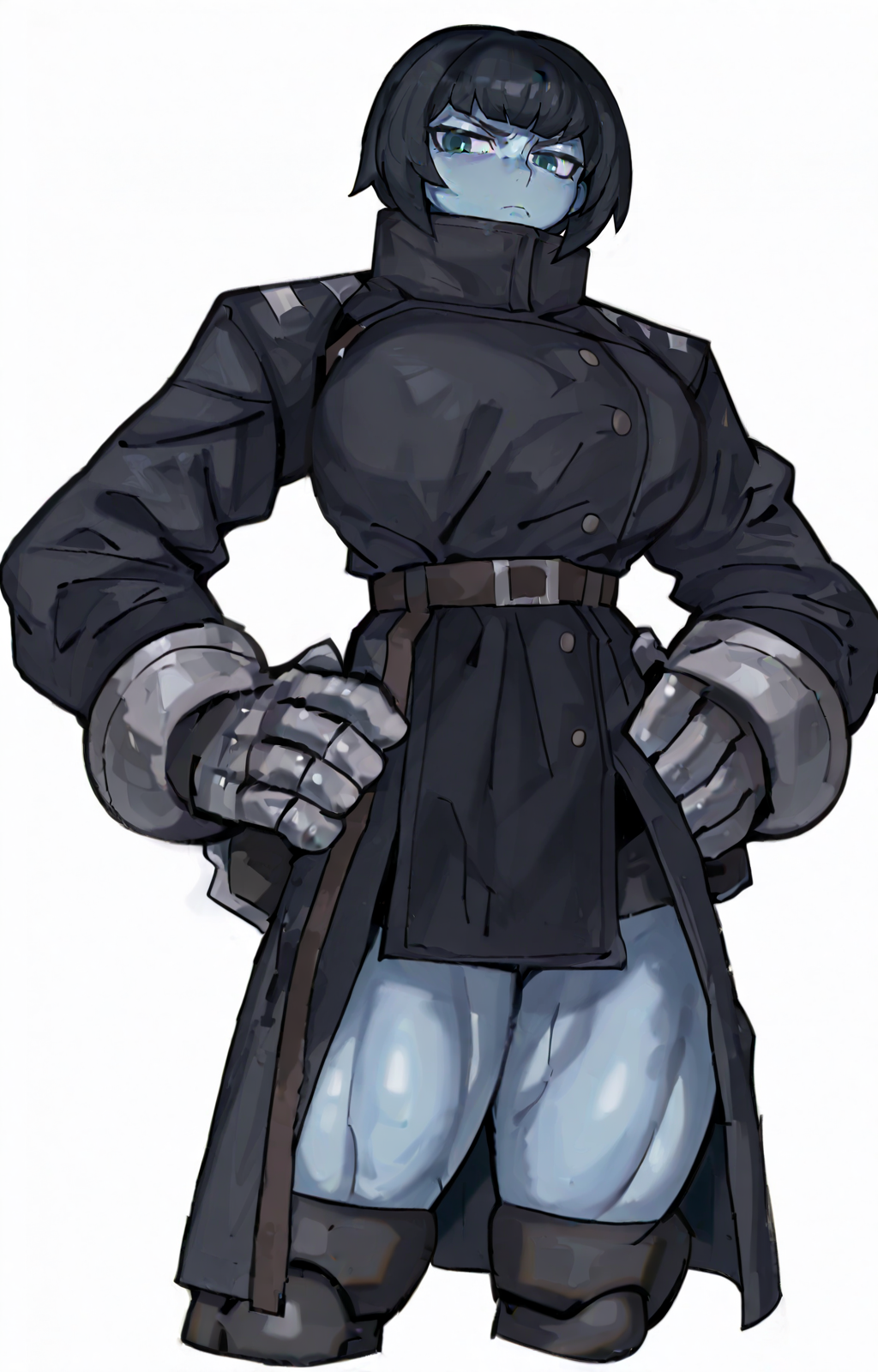 t103f , femtyrant, blue skin, muscular, black hair, short hair, power limiter, coat, belt, metal gauntlets