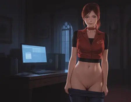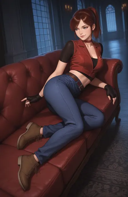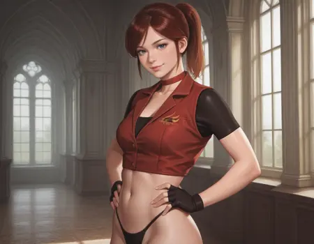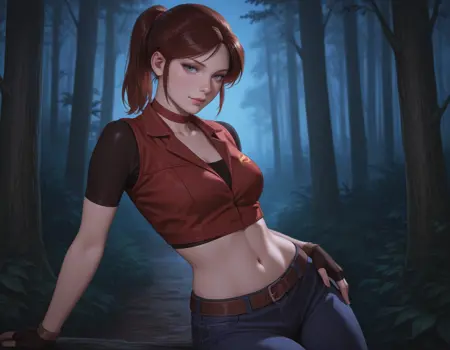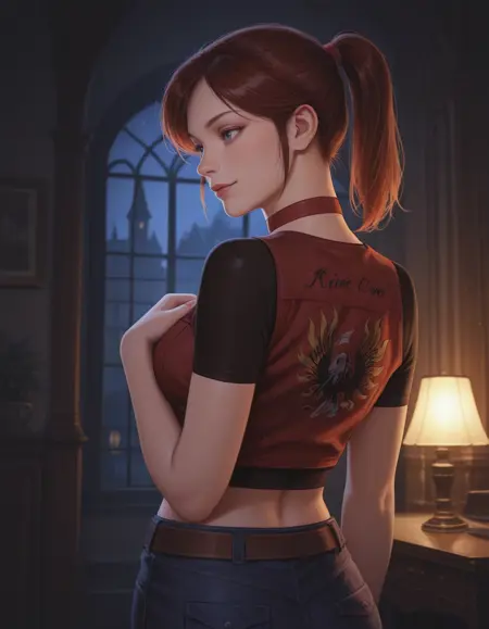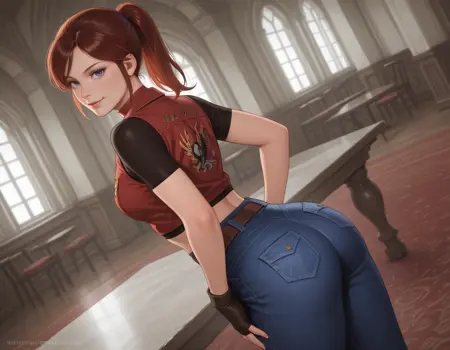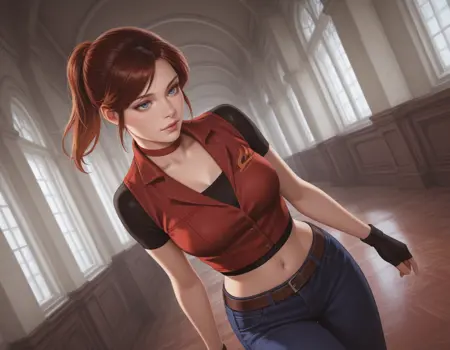 起始提示词:1girl, claire redfield, brown hair, ponytail, choker, blue eyes, breasts, buttons, midriff, fingerless gloves, high-waist pants, denim, jeans, belt