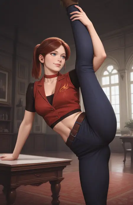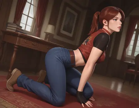 スタート用プロンプト:1girl, claire redfield, brown hair, ponytail, choker, blue eyes, breasts, buttons, midriff, fingerless gloves, high-waist pants, denim, jeans, belt