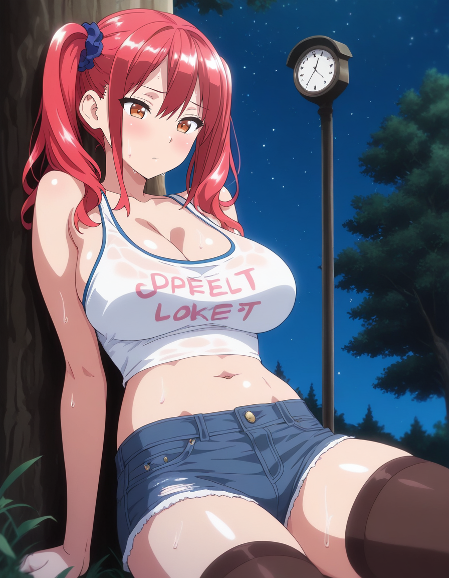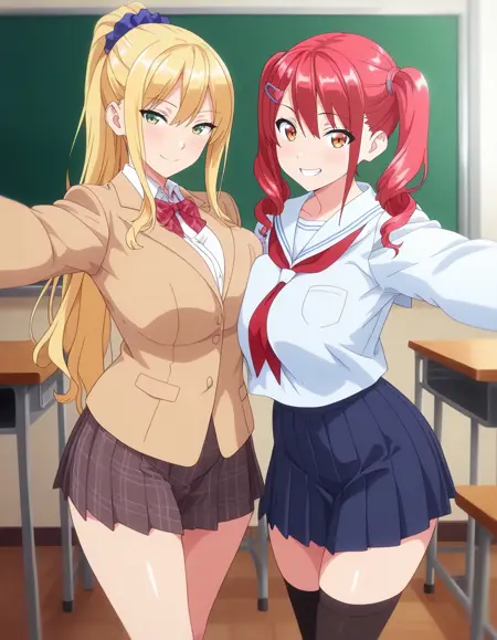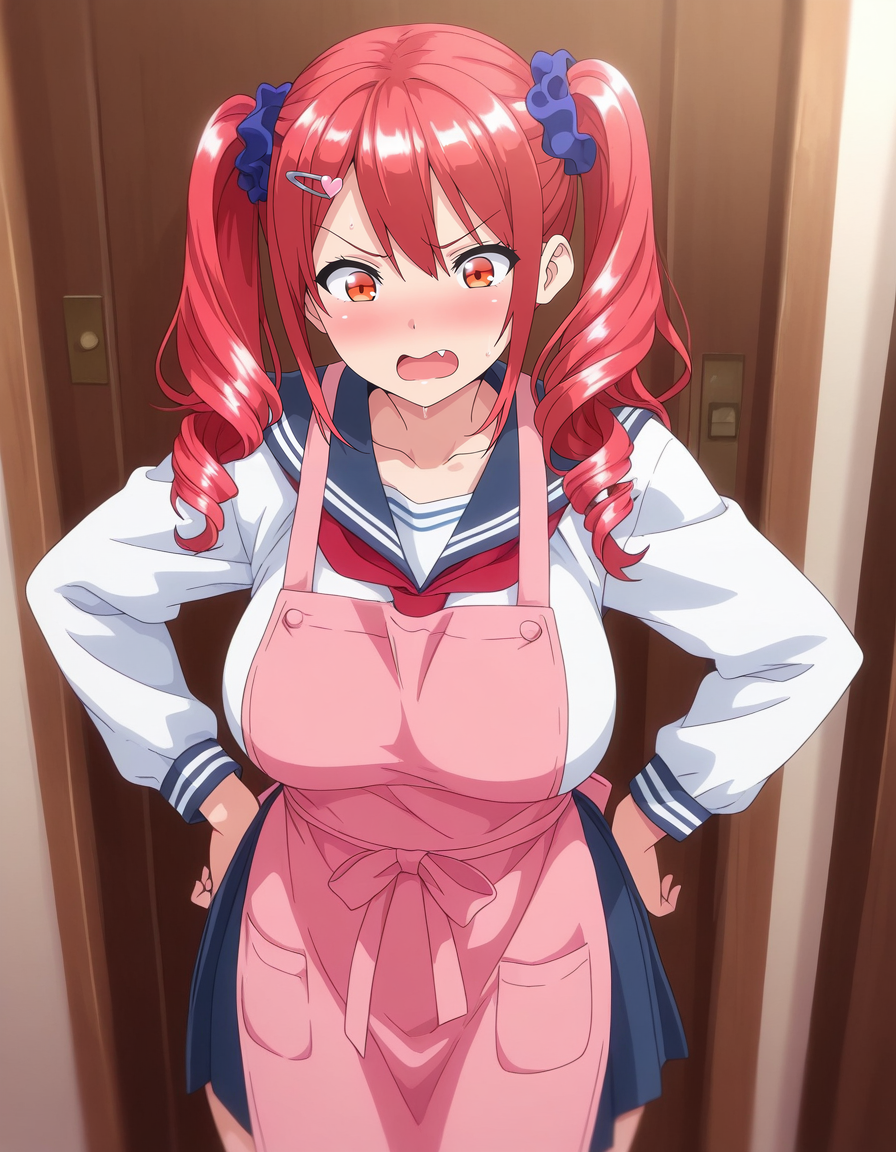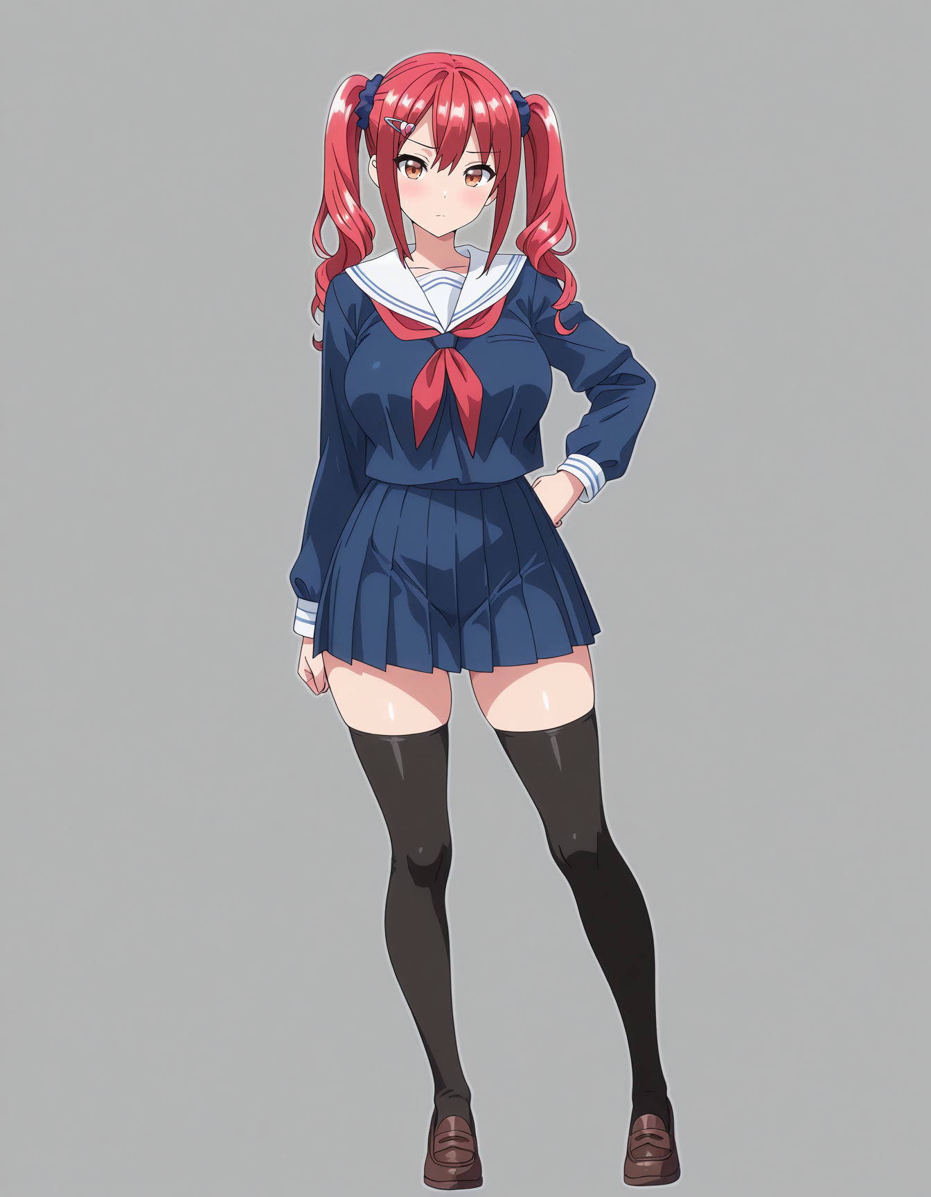 mai_sisb,mai_aina_omiya,twintails,red_hair,brown_eyes,large_breasts,hairclip,bowtie,blue_shirt,twin_drills,serafuku,pleated_skirt,black_thighhighs,loafers