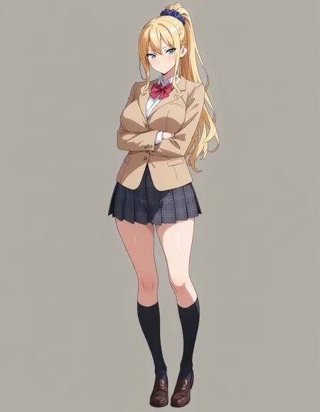 mai_sisb,mai_rena_oomiya,long_hair,ponytail,blonde_hair,green_eyes,blue_scrunchie,school_uniform,jacket,pleated_skirt,plaid_skirt,kneehighs,loafers