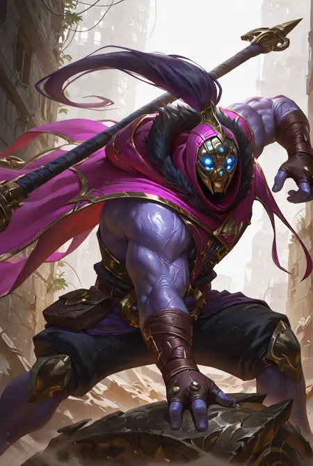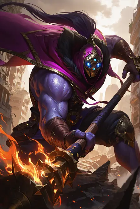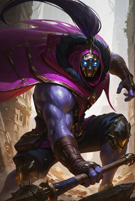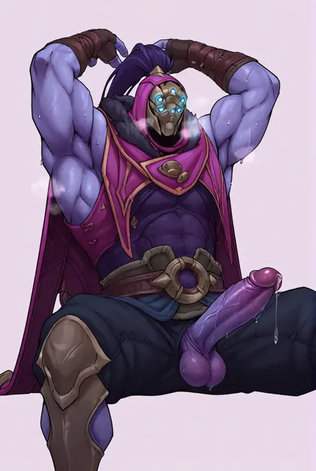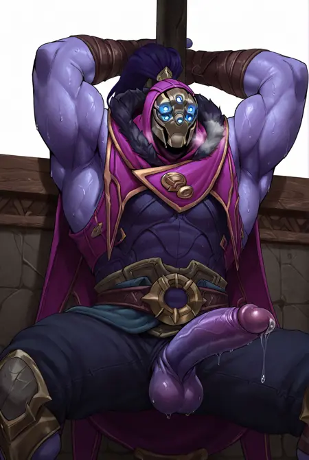 jax l0l, colored skin, 3 fingers, muscular, mask, hood, cape, armor, glowing eyes, gloves, ponytail, long hair