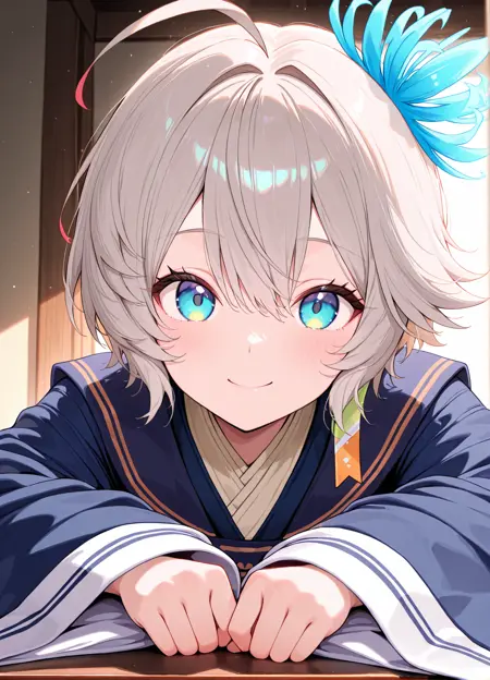 サンズ_アルファには、「sanzu_ms, blush, smile, 1girl, solo, looking at viewer, short hair, closed mouth, bangs, blue eyes, hair between eyes, ahoge, grey hair, wedding dress, purple waist strap」の使用をおすすめします。