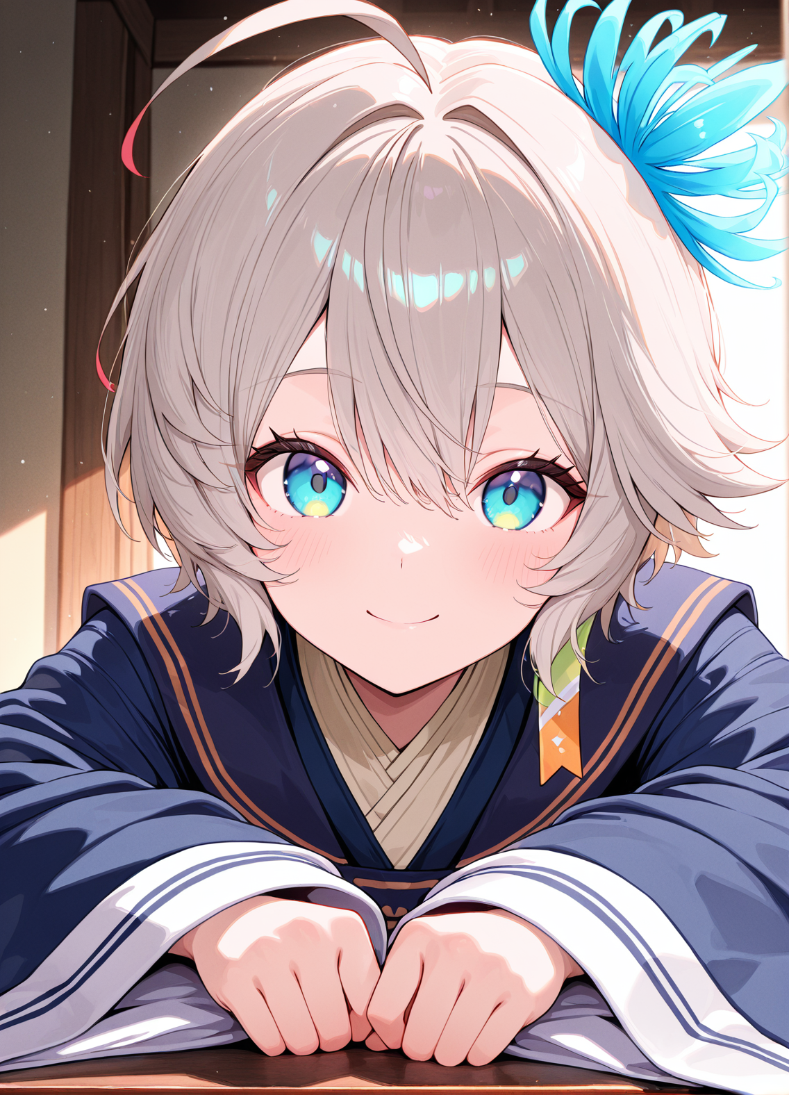 I recommend to use "sanzu_ms, blush, smile, 1girl, solo, looking at viewer, short hair, closed mouth, bangs, blue eyes, hair between eyes, ahoge, grey hair, wedding dress, purple waist strap" to sanzu_alpha