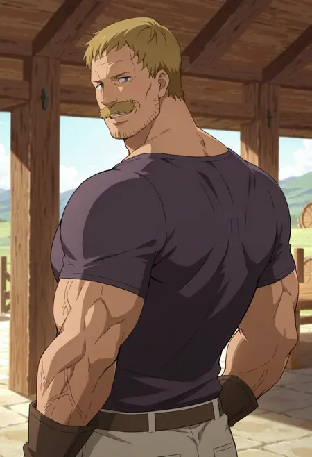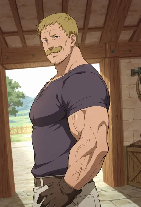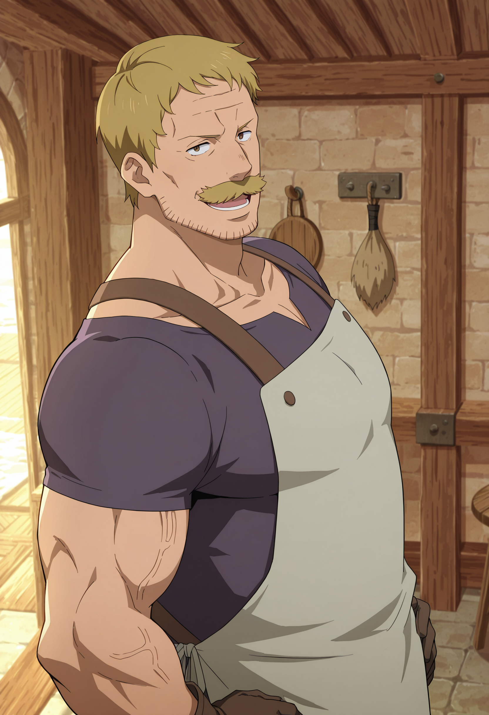 blonde hair, mustache, stubble, purple t-shirt, gray apron with brown straps, gloves, green pants